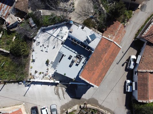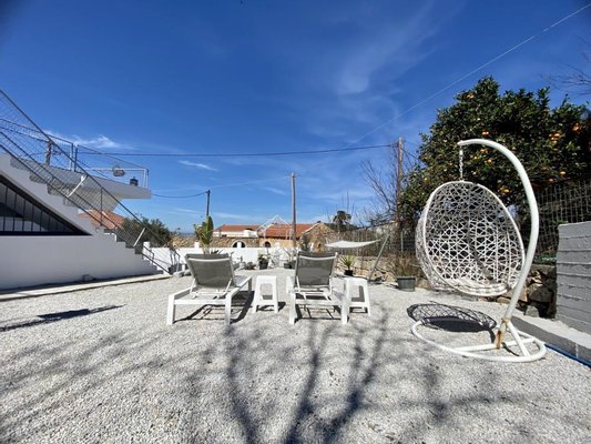 Der Eingang im Erdgeschoss ist von der Straße aus mit einem Tor versehen, das in einen Innenhof mit Essbereich im Freien führt. An der Seite der Villa befindet sich ein Landschaftsgarten mit einer Genehmigung und Lizenz, der bereits in der Hand ist und an den neuen Eigentümer weitergegeben wird, um einen überdachten Grillplatz und ein Schwimmbad einzuschließen Pool mit allen Architektenzeichnungen vorhanden. Auf der Rückseite des Grundstücks führt eine Wendeltreppe zu einer zweiten Terrasse mit herrlichem 360°-Blick auf die weißen Berge und das Meer.