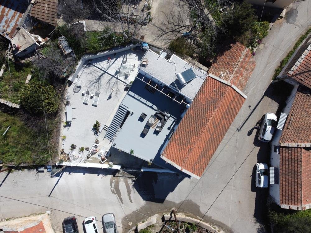 Die Unterkunft verfügt über mehrere Sitz- und Essbereiche im Freien sowie zwei Dachterrassen mit Panoramablick auf das Meer und die Berge.
