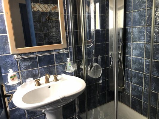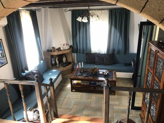 Die Villa erstreckt sich über zwei Ebenen. Im Erdgeschoss empfängt Sie ein charmanter Eingang aus lokalem Stein. Eine geflieste Treppe führt in einen hellen, offenen Raum mit einer gut ausgestatteten Küche auf der rechten Seite. Gegenüber der Küche befindet sich ein gemütlicher, abgesenkter Essbereich mit traditionellem Kamin und eingebautem Sofa, der eine warme und einladende Atmosphäre schafft. Auf dieser Ebene befindet sich außerdem ein komfortables Zweibettzimmer mit eigenem Bad – ideal für Gäste oder Familie.