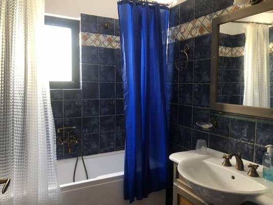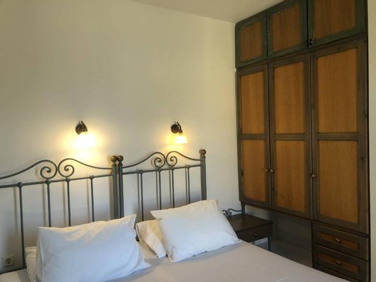 Über die Holztreppe gelangt man in die obere Etage. Dort befindet sich ein geräumiges Doppelzimmer mit eigenem Bad und Zugang zu einer privaten Terrasse mit herrlichem Blick auf die Ägäis – ein friedlicher Rückzugsort, um Sonnenuntergänge und die Morgenbrise zu genießen. Ein weiteres Zweibettzimmer mit eigenem Bad befindet sich ebenfalls auf dieser Etage und bietet Gästen und Bewohnern Flexibilität und Privatsphäre.