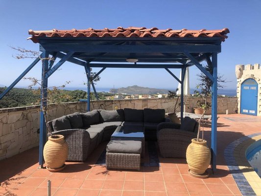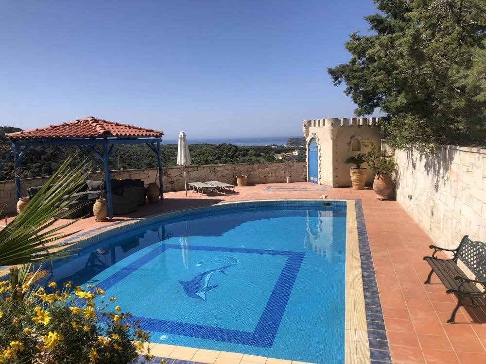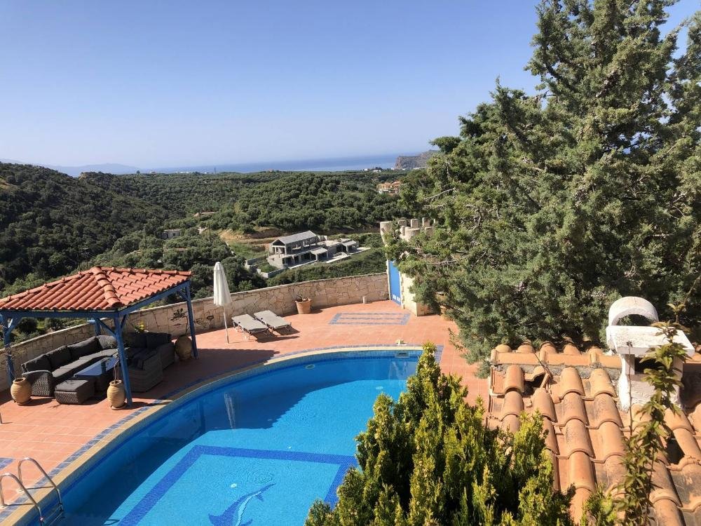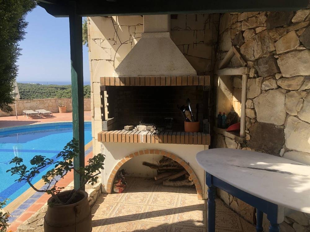 Die Außenbereiche der Villa sind ebenso beeindruckend. Ein aus Ziegeln und Stein gebauter Grillplatz öffnet sich zu einem wunderschön angelegten Garten und einem großen privaten Swimmingpool. Ein schattiger Sitzbereich unter einer hölzernen Pergola bietet den idealen Rahmen für Mahlzeiten im Freien, Unterhaltung oder einfach zum Genießen des unverbauten Blicks auf das Meer und die üppige kretische Landschaft.