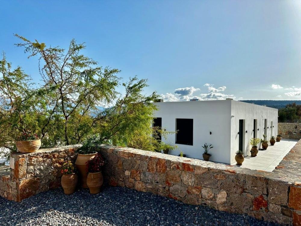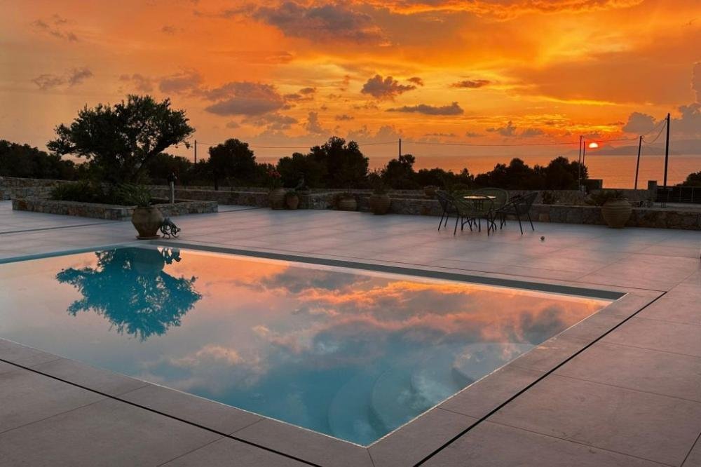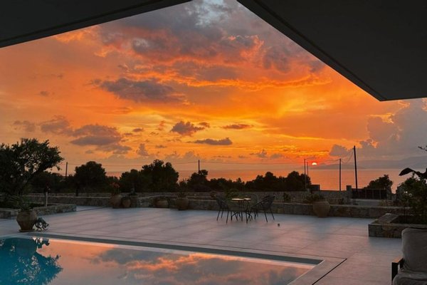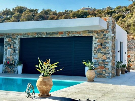 Vor der Villa befindet sich ein großzügiger Pool (ca. 32 m²), der beheizt werden kann (die Maschine ist vorhanden, aber noch nicht angeschlossen). Eine große Poolterrasse mit herrlicher Aussicht auf den Strand von Almyros und die Mirabello-Bucht vervollständigt dieses exquisite Anwesen.