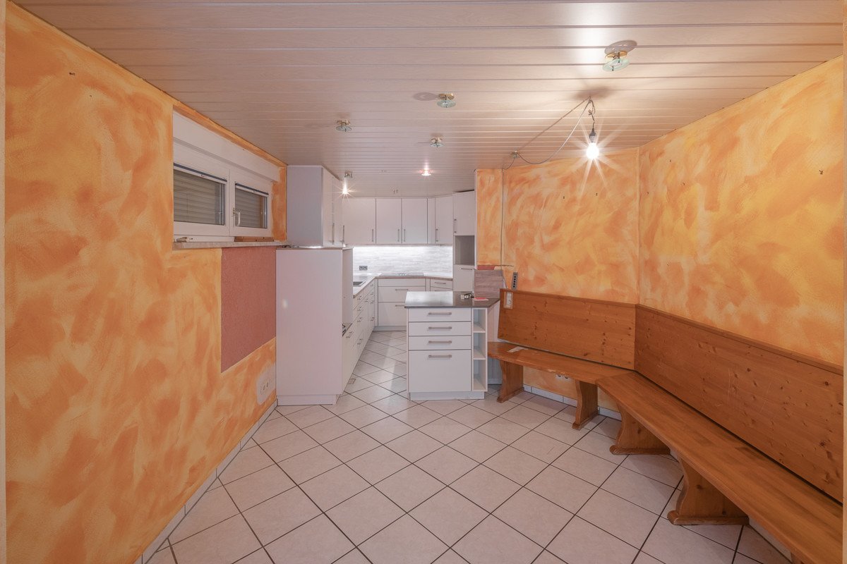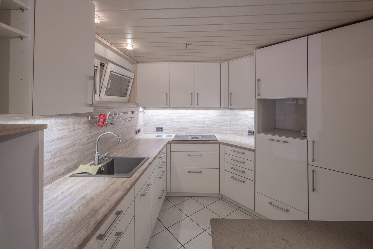 Die moderne Einbauküche ist ohne Elektrogeräte ausgestattet und bietet eine einladende Atmosphäre für kulinarische Kreationen.
