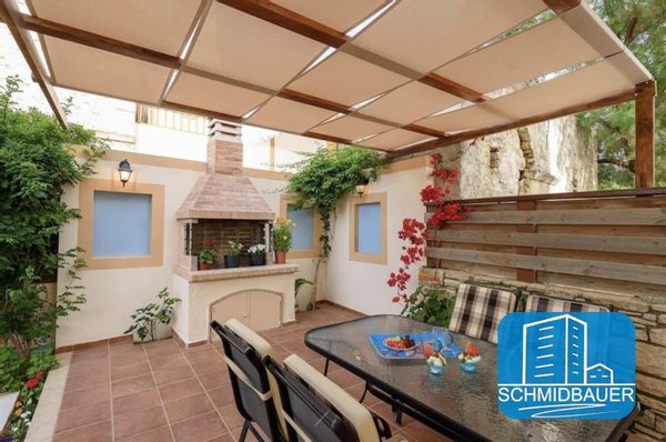 Diese wunderschöne traditionelle Villa hat eine Gesamtfläche von 115 m² und erstreckt sich über zwei Etagen. Im Erdgeschoss gibt es eine voll ausgestattete Küche, ein Esszimmer, ein Badezimmer und ein geräumiges offenes Wohn- und Esszimmer mit einem