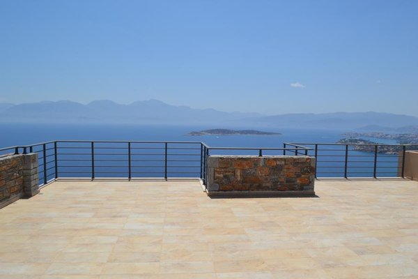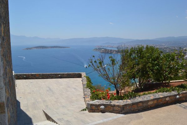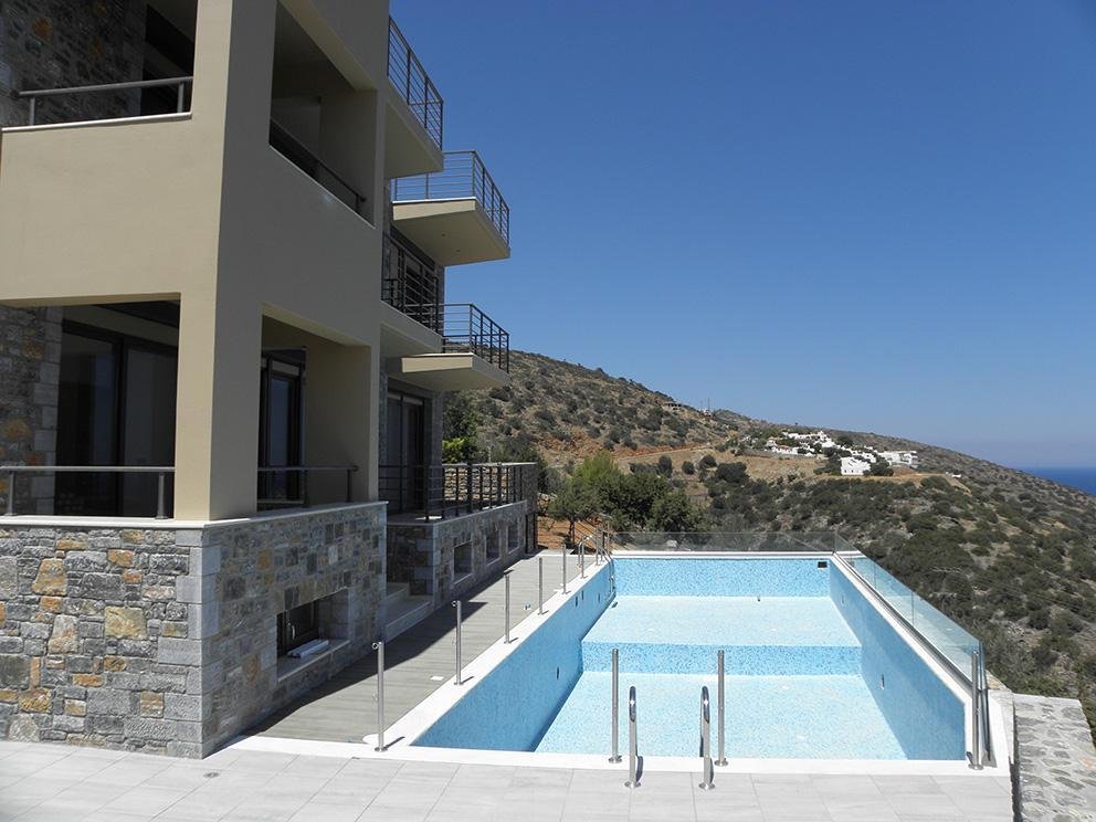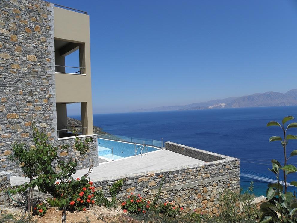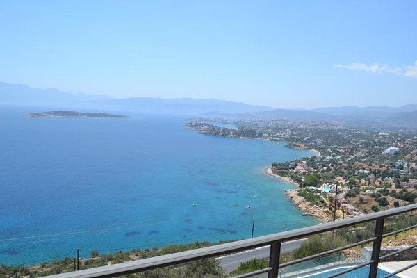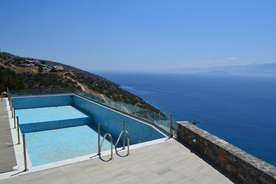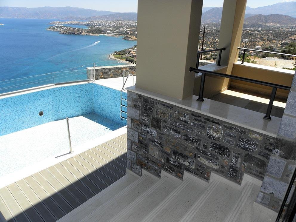 Zwei große Balkontüren blicken auf das wunderschöne blaue Wasser der Mirabello-Bucht und den Poolbereich.
