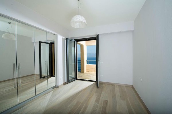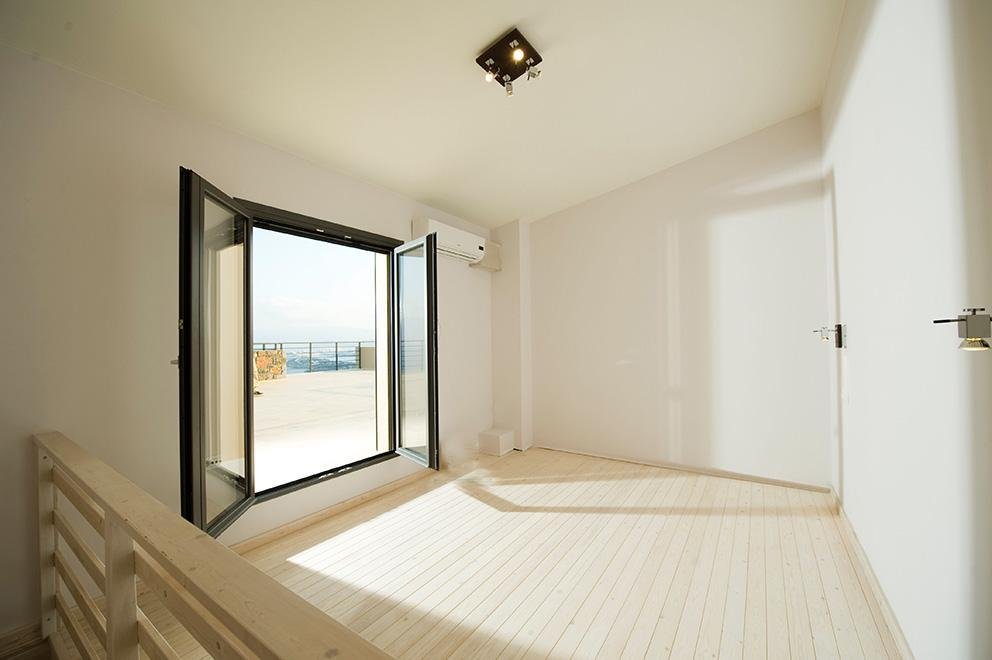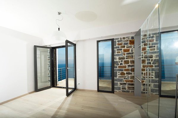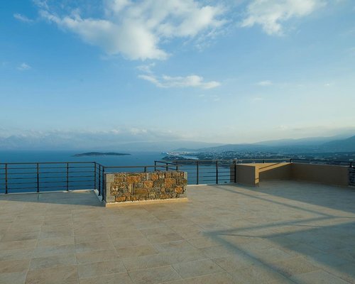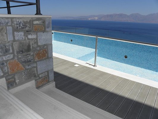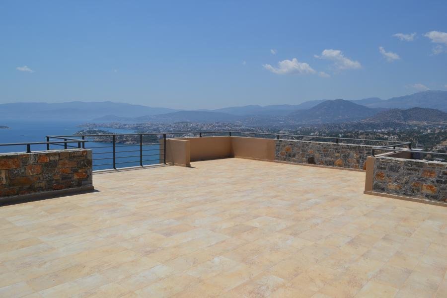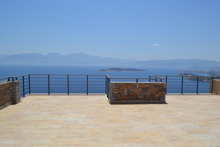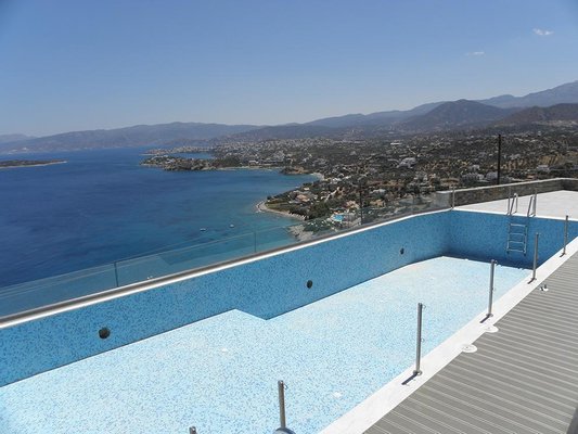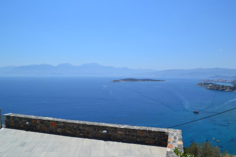 Zwei große Balkontüren blicken auf das wunderschöne blaue Wasser der Mirabello-Bucht und den Poolbereich.