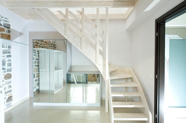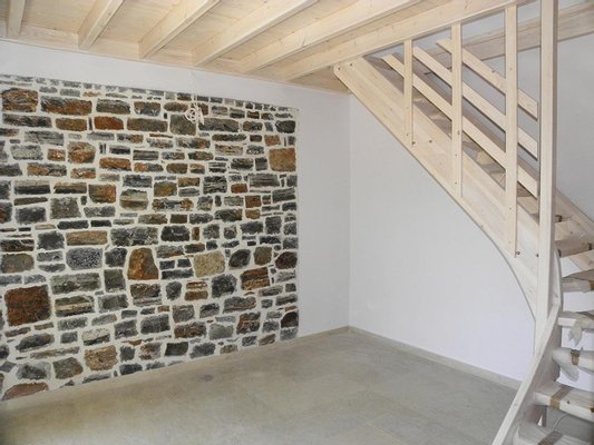 Der Eingang des Gebäudes führt zum offenen Wohnzimmer/Küche/Esszimmer mit Kamin. Die Wand dieses Zimmers ist mit farbenfrohen Natursteinen aus der Region verziert. Auf dieser Etage befindet sich auch ein Gästebad.