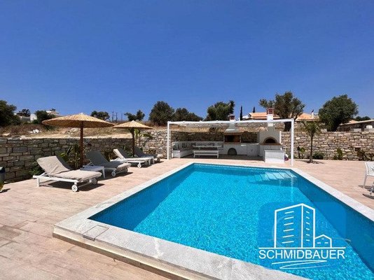 Diese moderne, einstöckige Villa verfügt über zwei Schlafzimmer mit eigenem Bad, ein WC und einen offenen Wohn- und Küchenbereich. Die Villa ist mit einer Kombination aus Steinen und modernen Fliesen gebaut. Im Garten befindet sich der Swimmingpool und Grillbereich, wo jeder die Sonne, den schönen Außenbereich und die Aussicht auf die Berge und den Ort Pitsidia genießen kann. Alle Zimmer haben Klimaanlage und Installation für Heizkörper.
