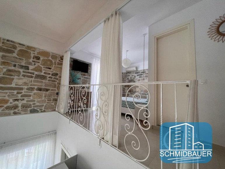 Diese moderne zwei-stöckige Steinvilla besteht aus einem offenen Küchen- und Wohnzimmerbereich, einem großen Badezimmer und einem Schlafzimmer mit Doppelbett und Fenstern mit Aluminiumrahmen, die zum Außengarten führen. Auf der zweiten Ebene befindet