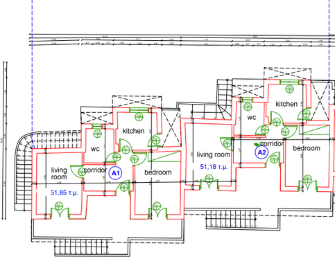 Jede der Wohnungen besteht aus 1 Wohnzimmer, 1 Flur, 1 Küche, 1 Schlafzimmer und 1 Badezimmer.