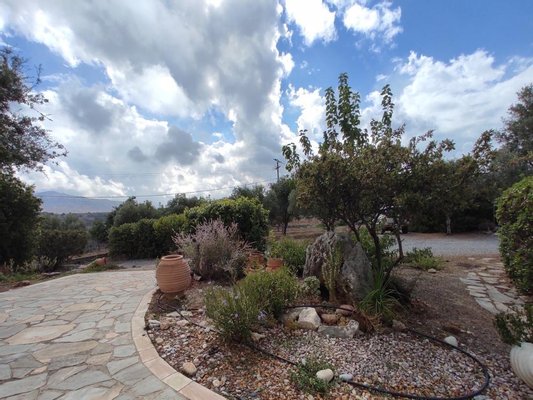 Draußen verfügt das Anwesen über einen Weinberg mit Cabernet-Sauvignon-Trauben und kretischen Rebsorten (Kotifali und Romeiko), die sich perfekt für die Weinherstellung eignen, sowie über Rosé- und grüne Tafeltraubensorten. Es gibt auch einen kleinen Koiteich, einen Olivenhain mit 26 ausgewachsenen Bäumen und verschiedene Nuss- und Obstbäume, darunter Äpfel, Pflaumen, Quitten, Maulbeeren, Johannisbrot, Bitterorangen, Zitronen, Mandeln, kleine violette Feigen und einen großen hundertjährigen grünen Feigenbaum. Es gibt auch ein großes externes Badezimmer und viel Platz für einen potenziellen großen Infinity-Pool, Whirlpool, Grill und Essbereich. Das angrenzende Grundstück kann als Erweiterung des Olivenhains und Weinbergs genutzt oder in Form von Tennis- oder Basketballplätzen in eine Unterhaltungsquelle verwandelt werden.