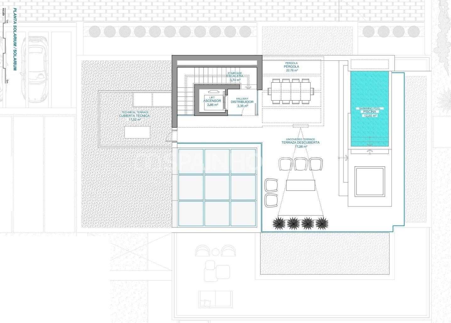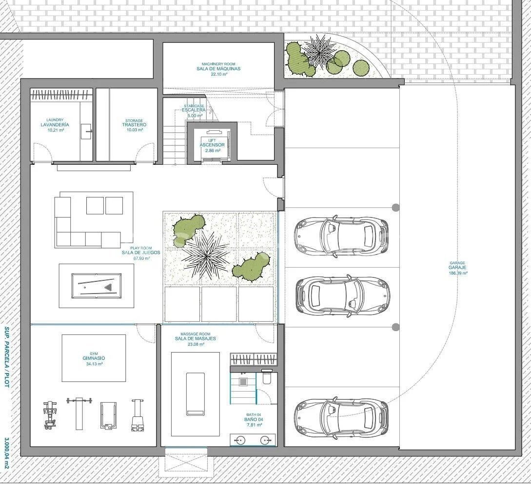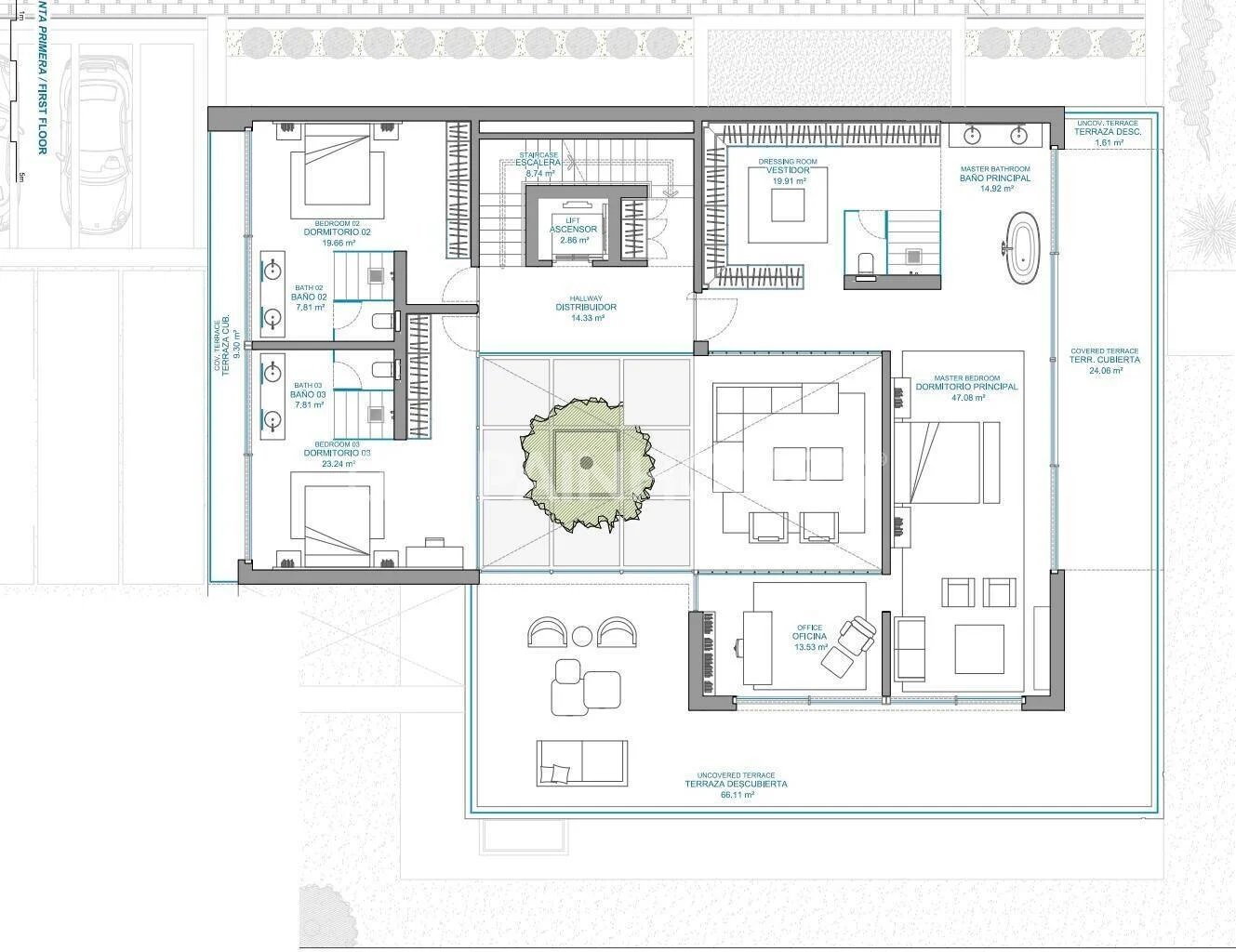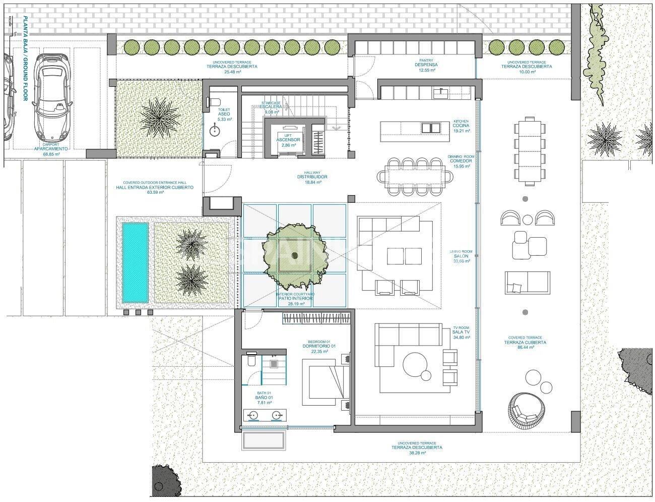 Es handelt sich um eine hochwertige Immobilie mit besonders großzügigen Innenräumen, die sich auf vier Ebenen verteilen, die durch einen privaten Aufzug verbunden sind. Der Grundriss der Villa wurde so konzipiert, dass die beste Verbindung mit dem Mittelmeer erreicht wird, um den atemberaubenden Meerblick zu betonen und funktionelle offene Räume auf allen Etagen zu schaffen.