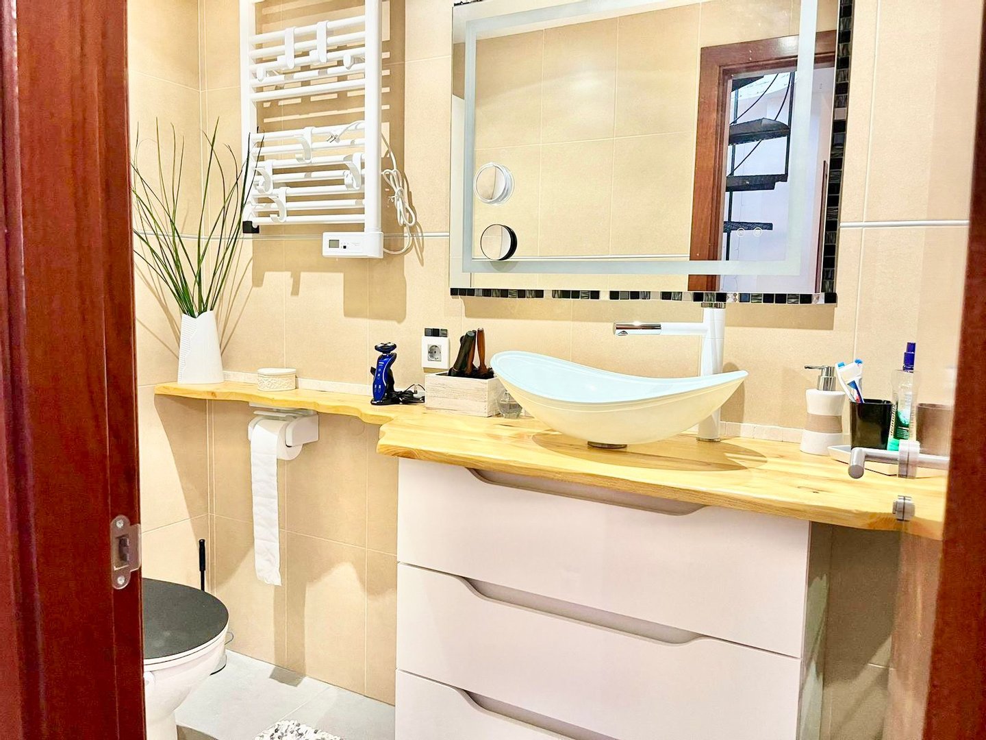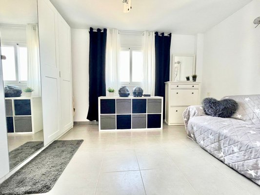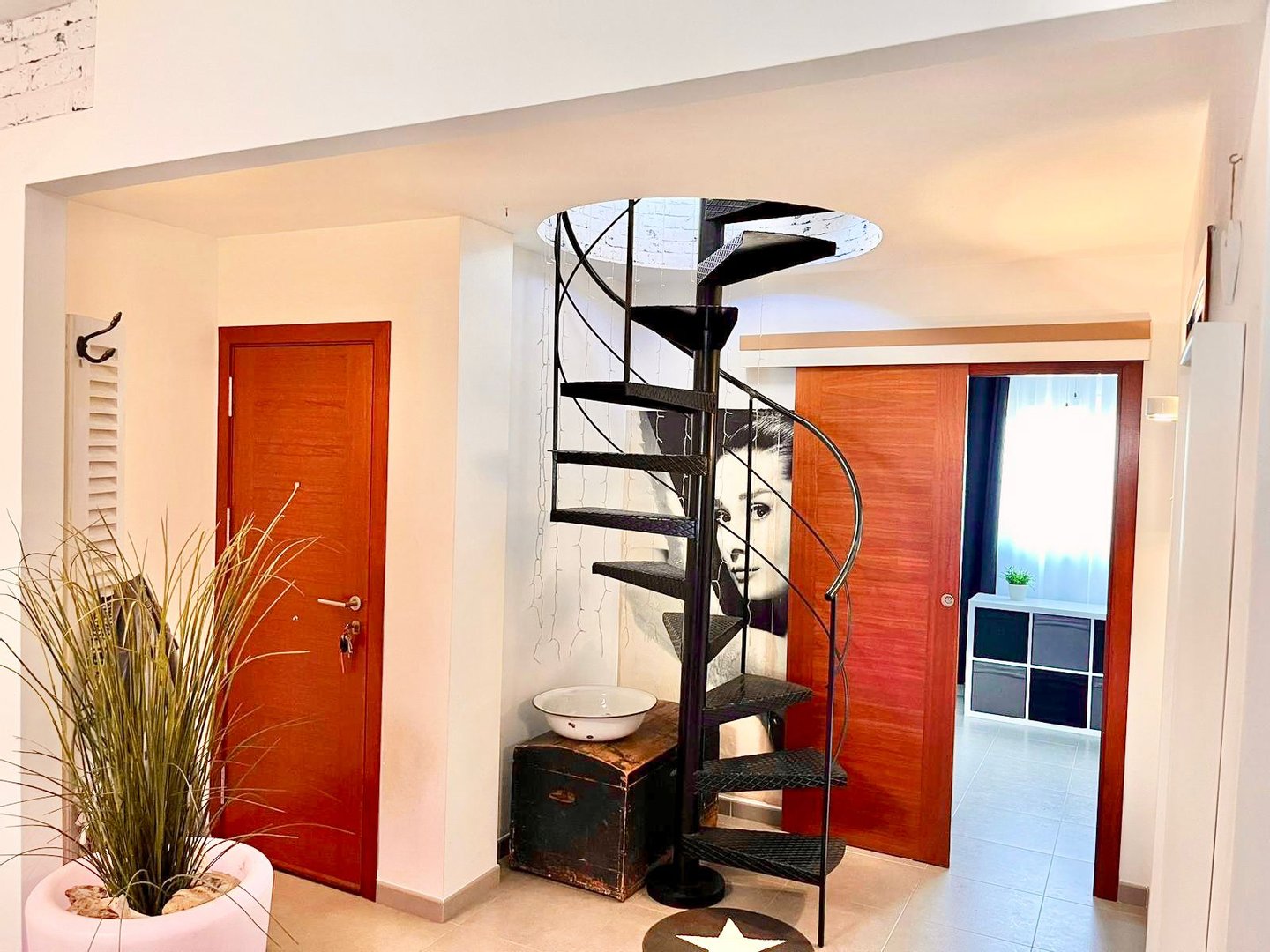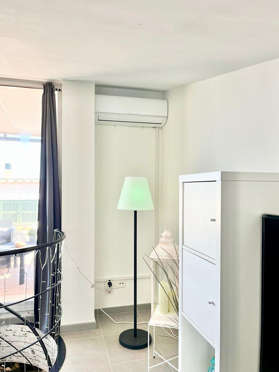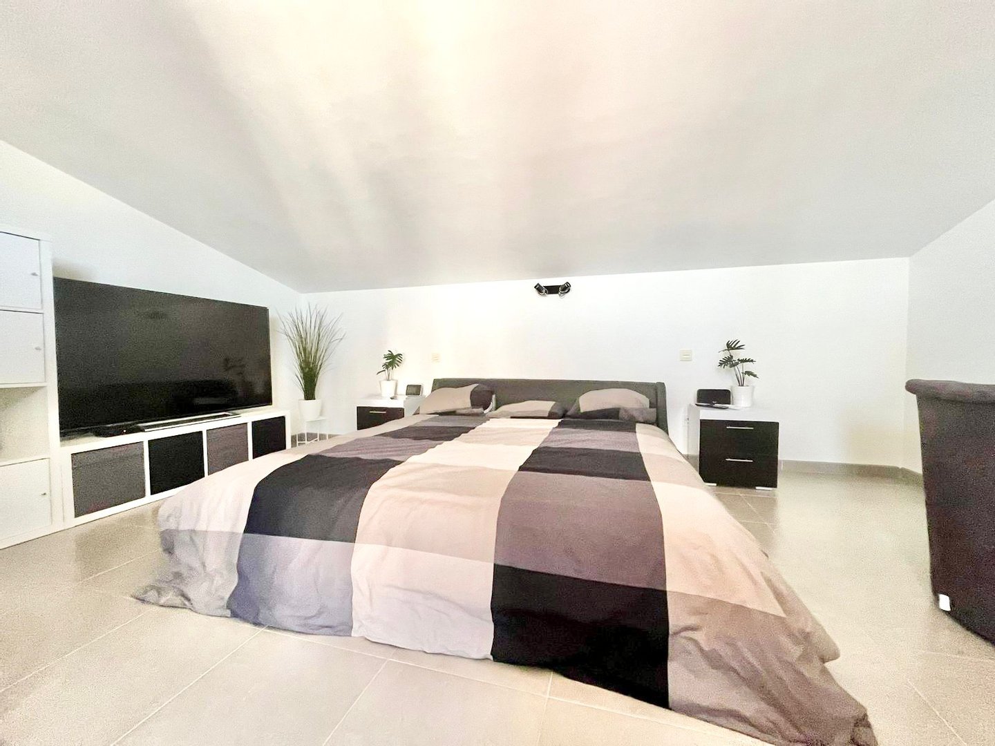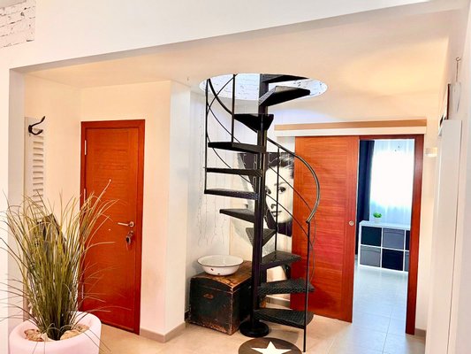 Die ebenfalls im Eingansbereich modern integrierte Wendeltreppe führt Sie nach oben in das großzügige Master-Schlafzimmer mit Zugang zur großen Dachterrasse mit fantastischem Blick auf Porreres.
