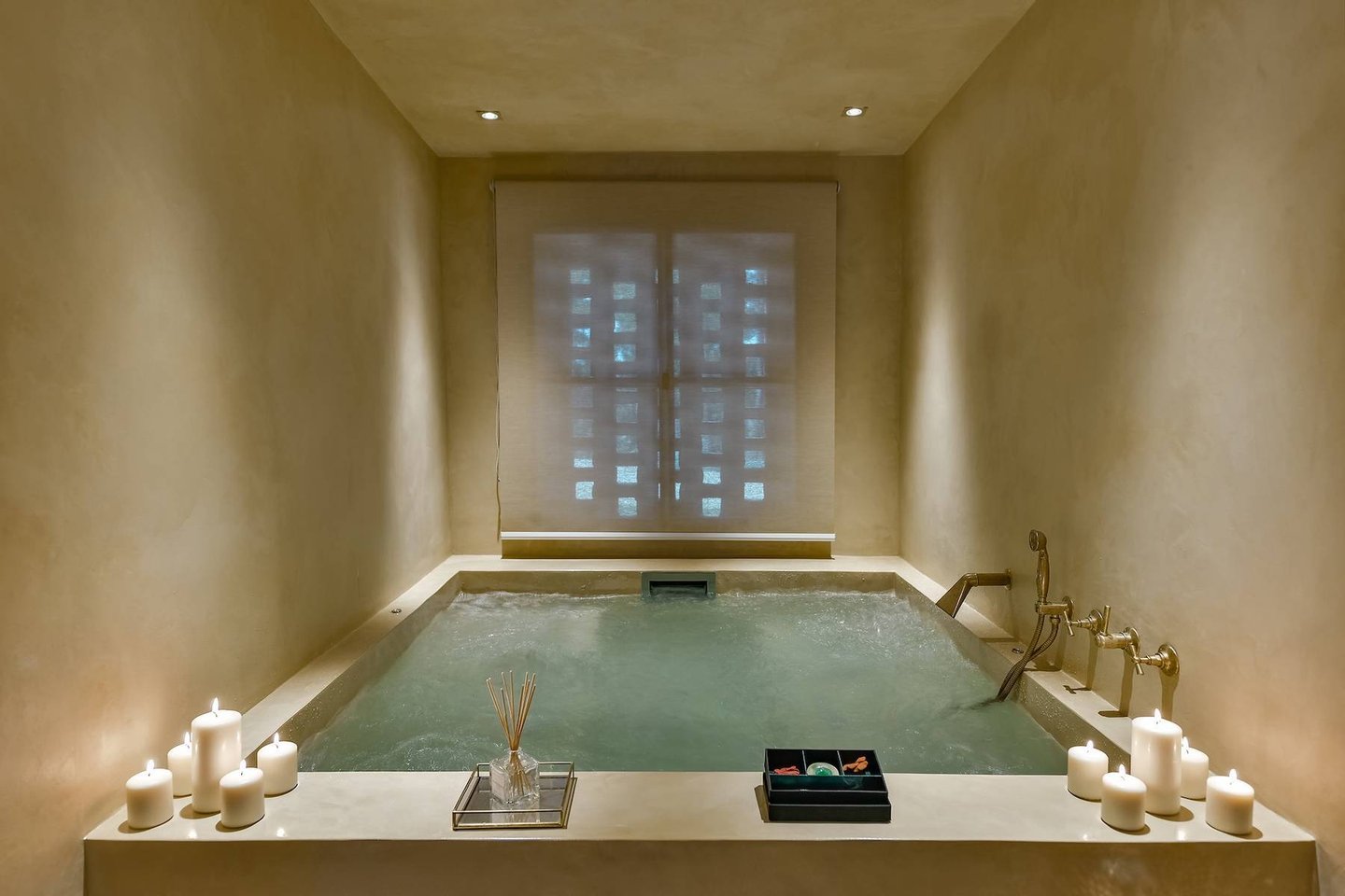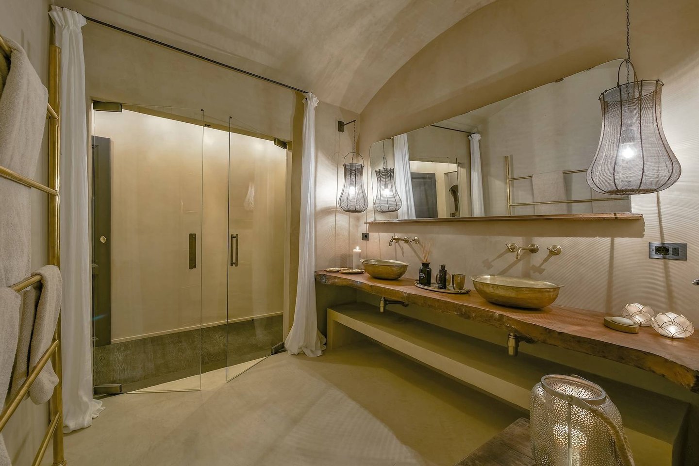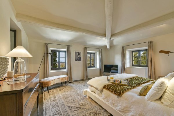 Mit ihren hohen, weiß gestrichenen Holzbalkendecken und den gemauerten Bögen bietet die Villa durch ihre großen Fenster malerische Ausblicke, die wie Gemälde wirken. Sie ist umgeben von Designelementen, exotischen Stoffen und mediterranen Lounge-Möbeln. Der Wohn- und Essbereich ist vollständig ausgestattet und umfasst eine hochmoderne Küche. Das Anwesen ist in drei Gebäude unterteilt: das Haupthaus mit 430 m², ein weiteres Gebäude mit 210 m², das die Turmresidenz beherbergt, sowie den Spa-Bereich. Im Haupthaus befinden sich zwei Schlafzimmer mit großzügigen Doppelbetten und eigenem Bad, eines davon als Master-Suite mit privater Terrasse. Der Turm verfügt über ein Schlafzimmer mit Doppelbett und eigenem Bad sowie zwei weitere Zimmer, die sich ein Badezimmer teilen - eines mit Doppelbett, das andere mit einem Etagenbett und zwei Einzelbetten. Zwei zusätzliche Schlafzimmer im Spa-Bereich sind mit einem Doppelbett und zwei Einzelbetten ausgestattet und teilen sich ein luxuriöses Spa-Bad mit Whirlpool.
