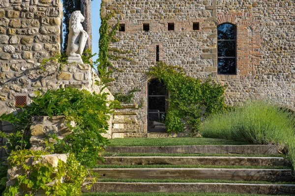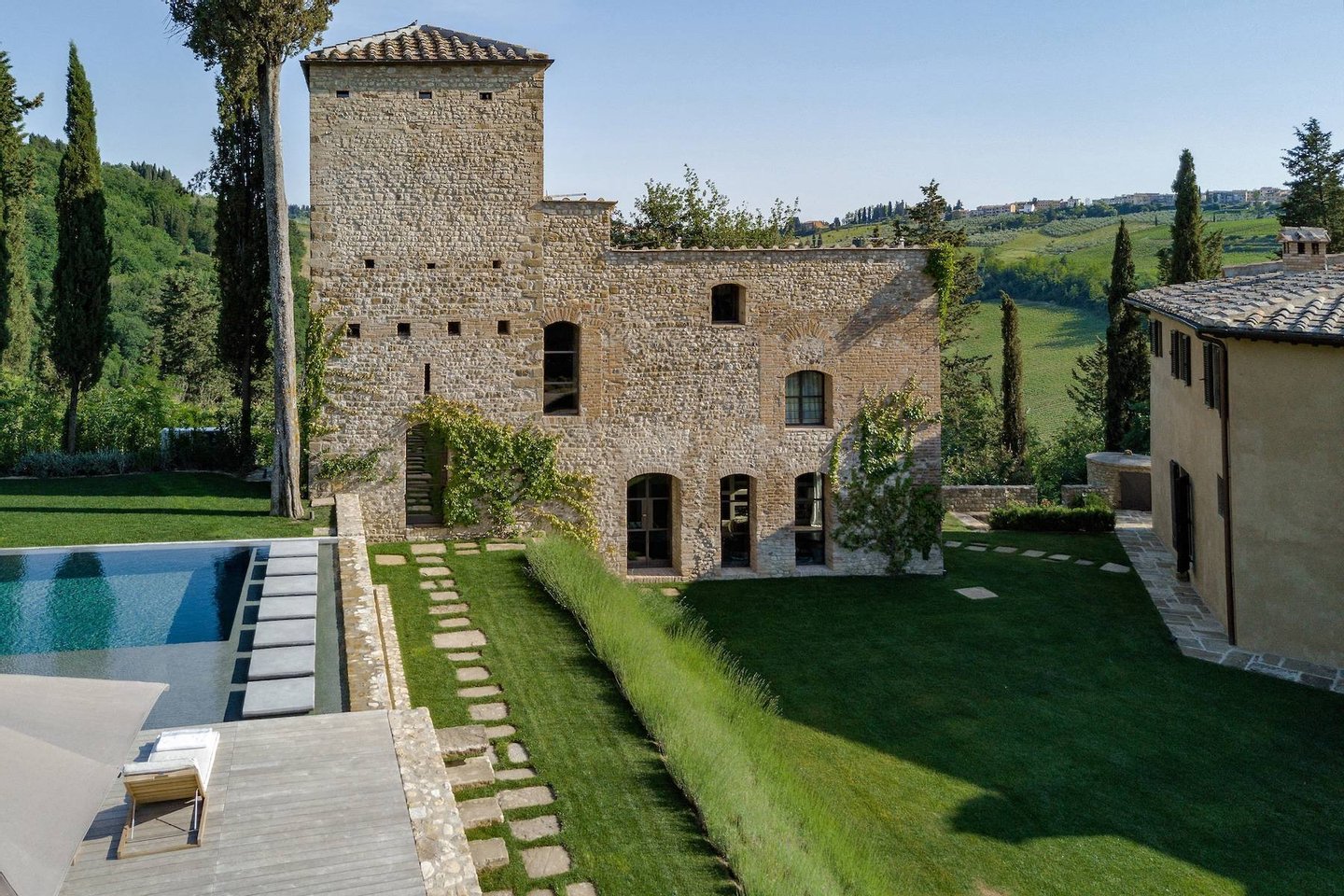 Wunderschön auf einem Hügel gelegen, nur eine halbe Stunde von Florenz entfernt, bietet dieses außergewöhnliche mittelalterliche Anwesen einen endlosen Blick auf Weinberge und Olivenhaine bis zu den fernen Alpen und das Schloss Santa Maria im Hintergrund.