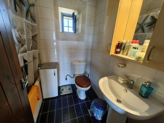 Im Obergeschoss befinden sich zwei Schlafzimmer, eines mit eigener Terrasse und Gemeinschaftsbad sowie ein Wohnzimmer, umgeben von großen Flügelfenstern mit Blick auf die weitere Umgebung. Der Zugang zum ersten Stock erfolgt über Innen- und Außentreppen. Außentreppen führen zu einem gepflasterten Innenhof, wo Sie viele Sitzbereiche sowie einen Grillplatz im Freien finden.