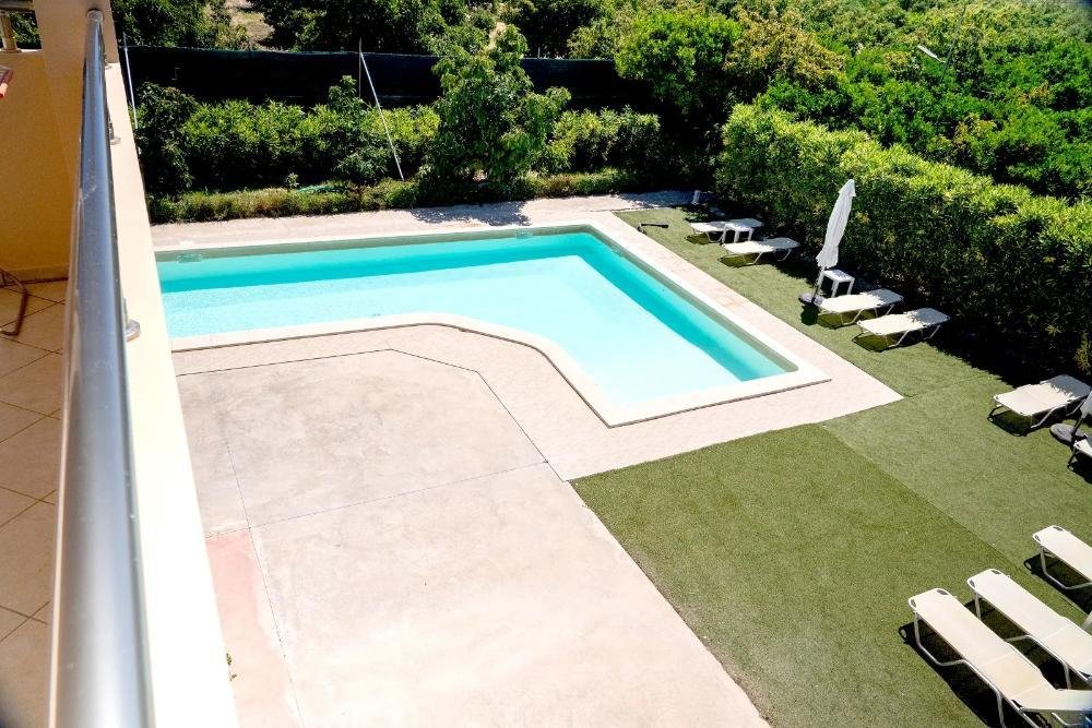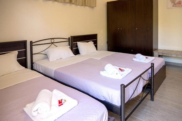 1. Zweistöckige Wohnungen mit einer Gesamtfläche von 125 m² (70+55). Jede Wohnung hat einen separaten Eingang. Die Wohnung im ersten Stock hat eine Außentreppe mit Granitmarmor. Genauer gesagt besteht sie aus: Erdgeschosswohnung 70 m² mit einer maximalen Kapazität von 5 Personen (hat 1 Kingsize-Doppelbett im ersten Schlafzimmer + 3 Einzelbetten im zweiten Schlafzimmer) + 1 (Schlafsofa) für Gäste. Insgesamt 2 Schlafzimmer + 1 Wohnzimmer + großer Hof und Gärten. Wohnung im ersten Stock 55 m², maximale Kapazität 4 Personen (hat 1 Kingsize-Doppelbett im ersten Schlafzimmer + 2 Einzelbetten im zweiten Schlafzimmer) + 1 (Schlafsofa) für Gäste. Insgesamt hat sie 2 Schlafzimmer + 1 Wohnzimmer + 4 große Balkone. Sie hat einen Hof von 2.250 m² und 3 Parkplätze sowie einen Swimmingpool von 50 m².