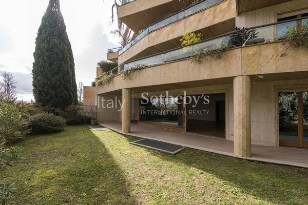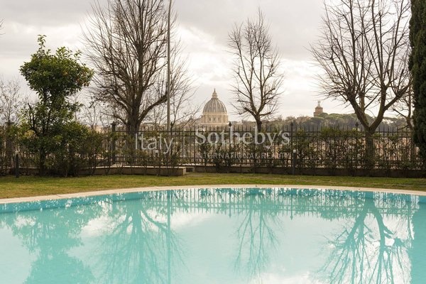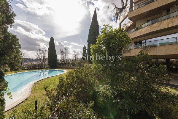 Within an elegant residential complex featuring a panoramic communal swimming pool, this refined apartment boasts a privileged position offering breathtaking views of Rome's Historic Center and the iconic St. Peter's Dome, complemented by a spacious and meticulously maintained private garden.