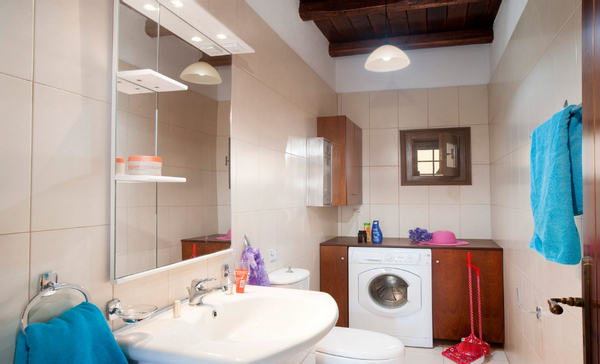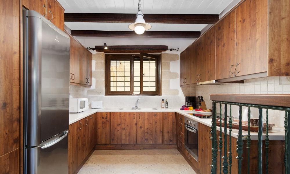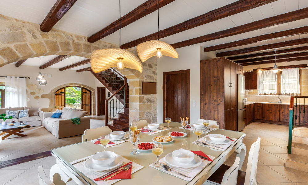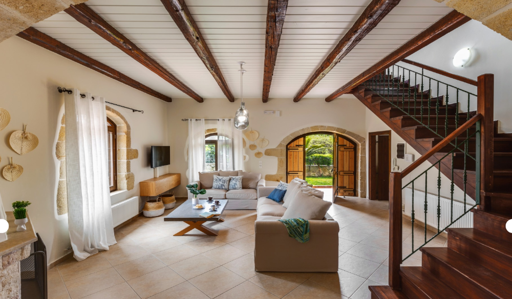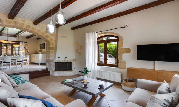 Im Erdgeschoss finden wir das Wohnzimmer mit Holzdecken und Steinelementen, die einige traditionelle kretische Merkmale bewahren. Die warme Atmosphäre wird durch den Kamin verstärkt. 2 kleine Stufen führen uns zum Esszimmer und links sind die voll ausgestattete Küche und ein WC. Es gibt auch ein Schlafzimmer mit einem Doppelbett und ein eigenes Badezimmer mit Badewanne.