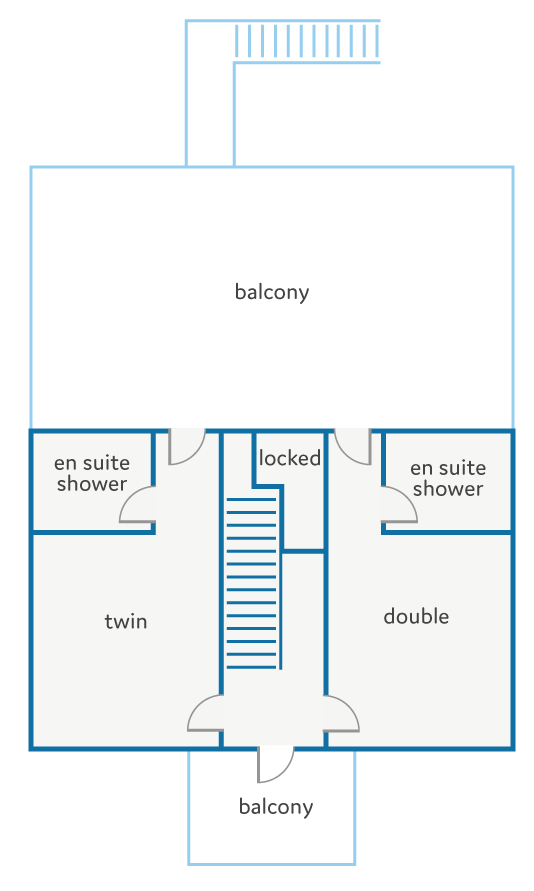 Über die interne Holztreppe gelangen wir in die obere Etage, wo sich zwei Schlafzimmer mit jeweils eigenem Duschbad befinden. Diese Ebene bietet Zugang zur großzügigen Terrasse mit Sitzecke und Blick auf die Landschaft. Von der Terrasse aus gelangt man über eine Außentreppe zum Poolbereich. Außerdem gibt es einen weiteren kleinen Balkon mit Blick auf die Nachbarschaft und das gesamte Dorf.
