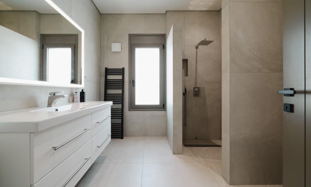 Auf derselben Ebene gibt es 2 separate Räume, die als Speisekammer und Waschküche genutzt werden, mit zusätzlichem Stauraum, der für mehr Komfort sorgt. Der Zugang zum Erdgeschoss erfolgt entweder über eine Innentreppe oder direkt von der unteren Gartenebene aus, wo sich das verbleibende Doppelzimmer für die Gäste und 2 sehr geräumige Zimmer befinden, die in ein Fitnessstudio, ein Spielzimmer oder ein Heimkino umgewandelt werden können.