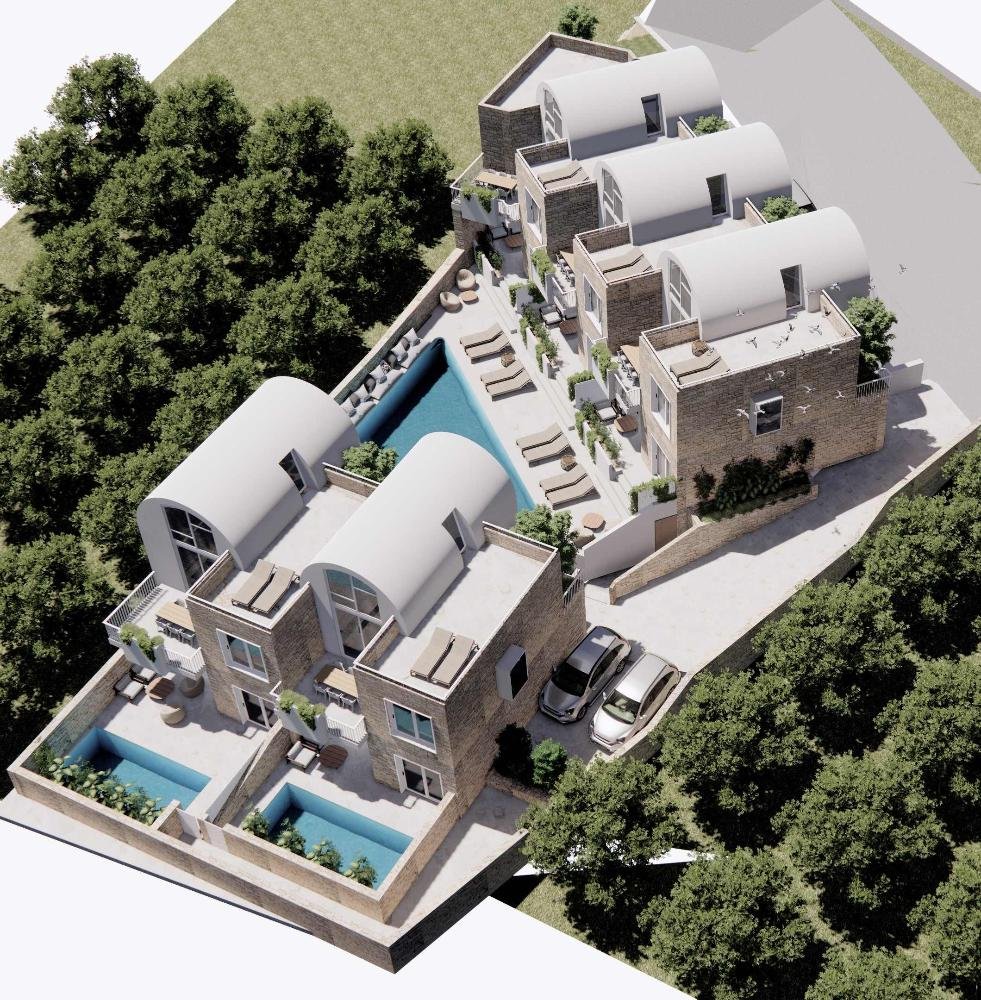 Von der Halle im Erdgeschoss gibt es Zugang zur privaten Terrasse und einem 57 m² großen Gemeinschaftspool für die Villen 1-4. Villa 5 verfügt über einen privaten Pool von 15 m² und Villa 6 über einen privaten Pool von 19 m².