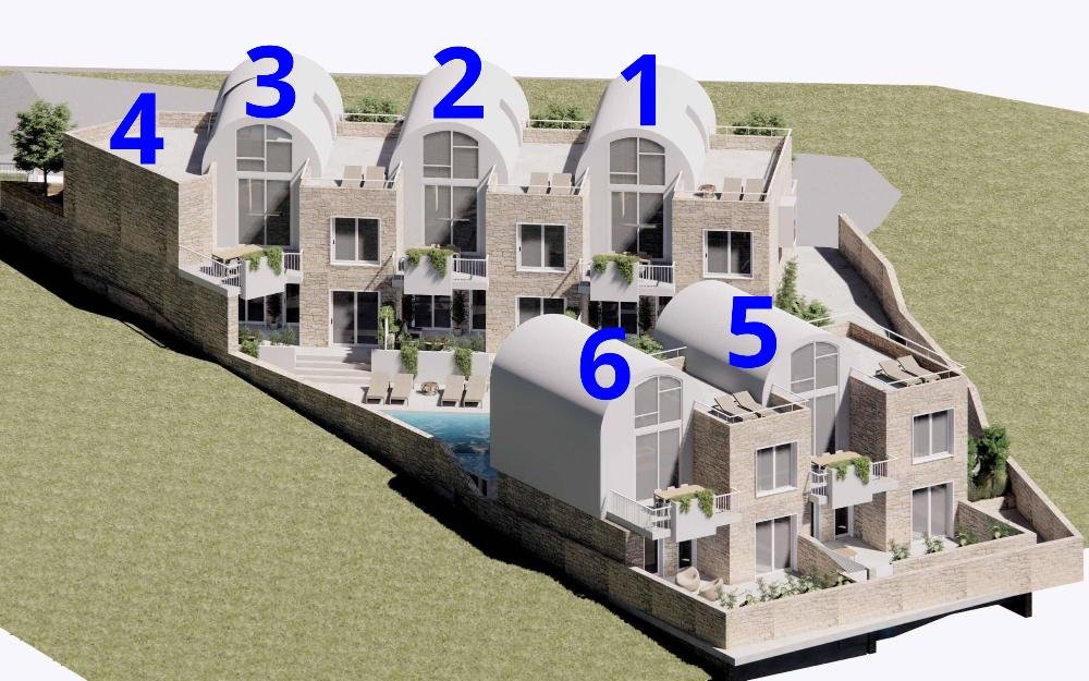 Gemeinsames Schwimmbad für Villa 1-4. Der Pool ist beheizt und mit Salzwasser ausgestattet. Das Bauwerk wird aus Stahlbeton hergestellt und es wird einen unterirdischen Maschinenraum geben für den Sandfilter. Aus Sicherheitsgründen werden wasserdichte LEDs installiert, Fliesen und ein rutschfester Rand aus Marmor. In der Nähe des Pools wird es eine Außendusche geben.