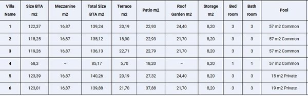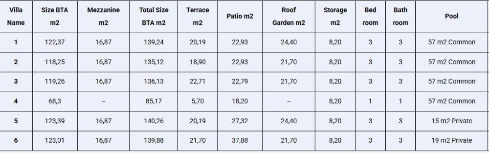 Alle Villen verfügen über einen 8 m² großen Lager-/Anlagenraum unter dem Gemeinschaftspool sowie den Komfort eines privaten Parkplatzes neben dem Eingang des Grundstücks mit einer Pergola für Schatten.