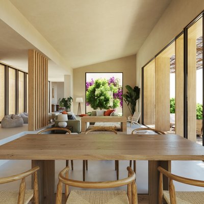 Der große Tagesbereich ist ein einziger offener Grundriss, der sich zur Terrasse mit Blick auf den Pool und den Garten hin öffnet.