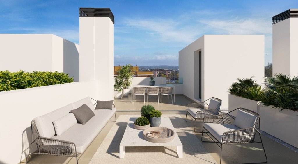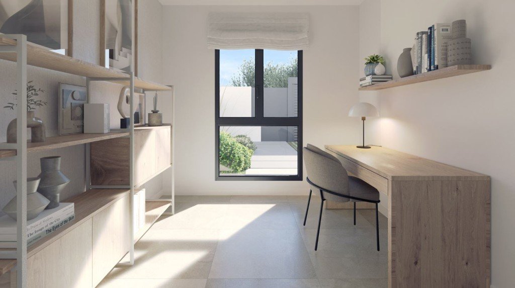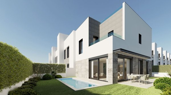 Alle Häuser haben im Erdgeschoss einen großzügigen, offen gestalteten Wohn-Ess-Bereich mit offener Küche, der sich zur Terrasse und zum Garten mit privatem Pool hin öffnet, einen Hauswirtschaftsraum sowie ein Schlafzimmer und ein Badezimmer. Auf der ersten Etage befinden sich drei Schlafzimmer und zwei Badezimmer, eins davon en Suite. Die private Sonnen-Dachterrasse gibt dem Haus ein weiteres fantastisches Highlight.