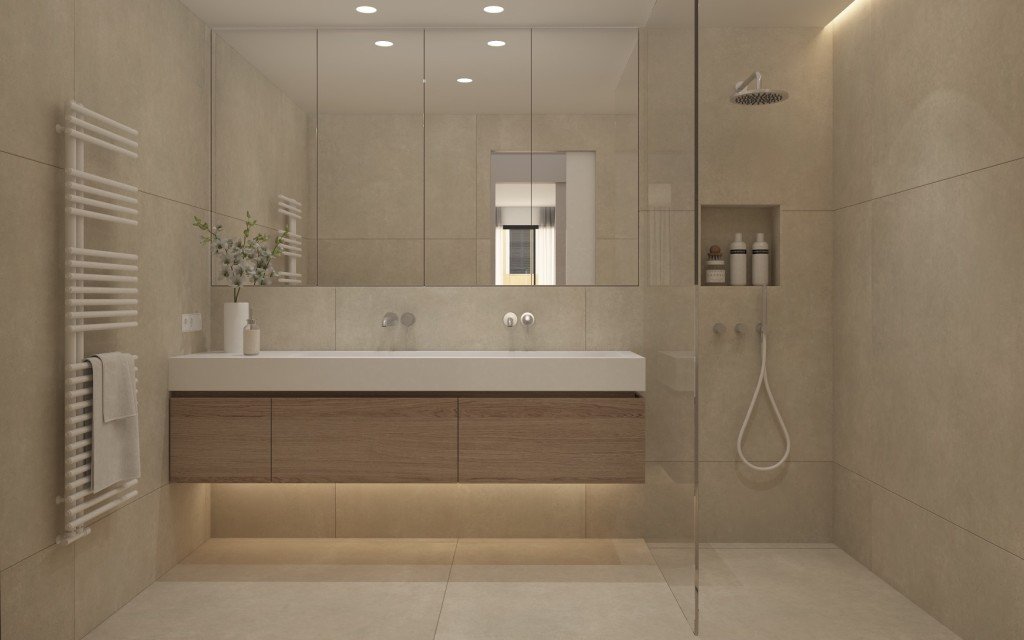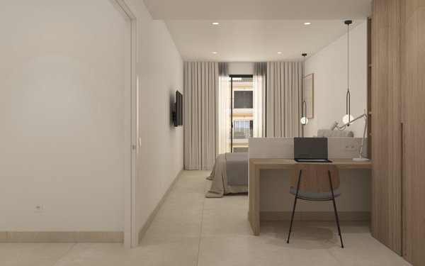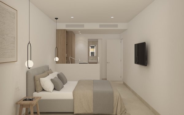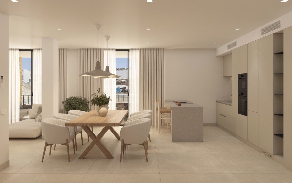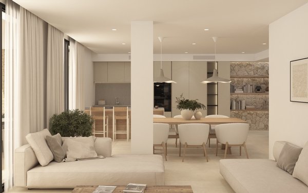 Die Wohnung der Luxusklasse liegt in der 1. Etage des Wohngebäudes und bietet einen großen Wohn-Essbereich mit offener Küche von 38 m2, 2 Schlafzimmer und 2 Badezimmer, beide en Suite, wobei das Hauptschlafzimmer auch noch über einen geräumigen Ankleidebereich verfügt. Das Highlight ist der große und nach Südost ausgerichtete Balkon, der über den hellen Wohnbereich zugänglich ist und den Wohnbereich in den Außenbereich übergehen lässt. Der überdachte Balkon ist ein wundervoller Platz, um gesellige Stunden oder auch einfach nur die Sonne Mallorcas zu genießen.