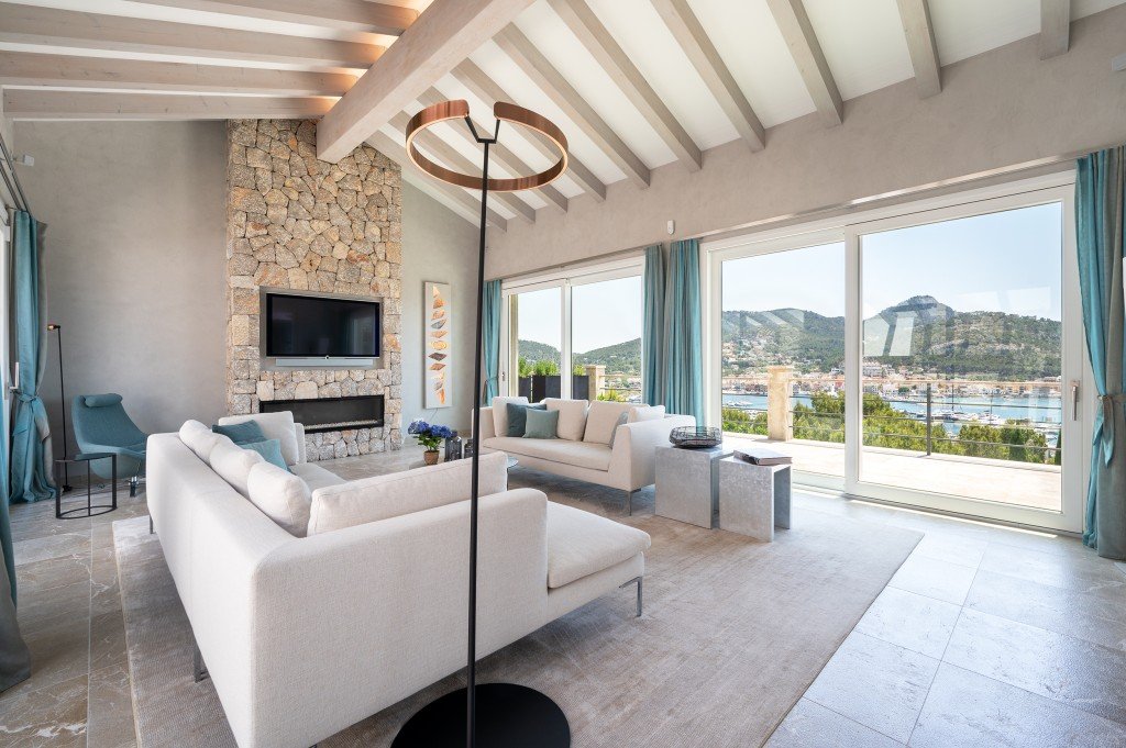 Im oberen Geschoss befindet sich ein Wohnzimmer mit Kamin von dem man auf eine gemütliche Veranda mit Barbeque gelangt. Von beiden Bereichen hat man vollen Meerblick. Über das Esszimmer gelangt man in die offene "Birgit Müller" Küche mit angeschlossenen Hauswirtschaftsbereich und grossem Abstelltraum. Durch bodentiefe Fensterelemente gelangt man auf eine großzügige Terrasse mit Blick auf das Meer und über Puerto Andratx.