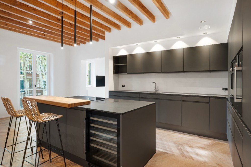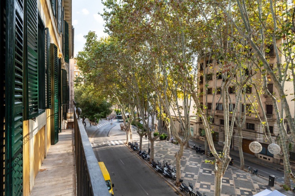 Das charmante Gebäude aus dem Jahr 1880 beherbergt insgesamt 15 Wohn- und Geschäftseinheiten und ist eingebettet in eine der grünsten und begehrtesten Gegenden von Palma. Die Wohnung liegt im dritten Stock und beim Eintreten gelangen Sie in einen kleinen Eingangsbereich im Flur, der Sie direkt in den großzügigen Wohn-Ess-Bereich führt. Mit einer modernen, offenen Küche samt Kochinsel und bodentiefen Fenstern, die zu charmanten französischen Balkonen führen, ist dieser Raum lichtdurchflutet und lebendig – perfekt für ein Leben in Mallorcas Hauptstadt.