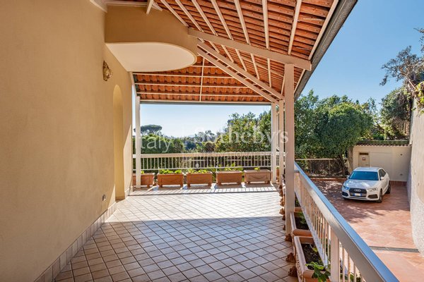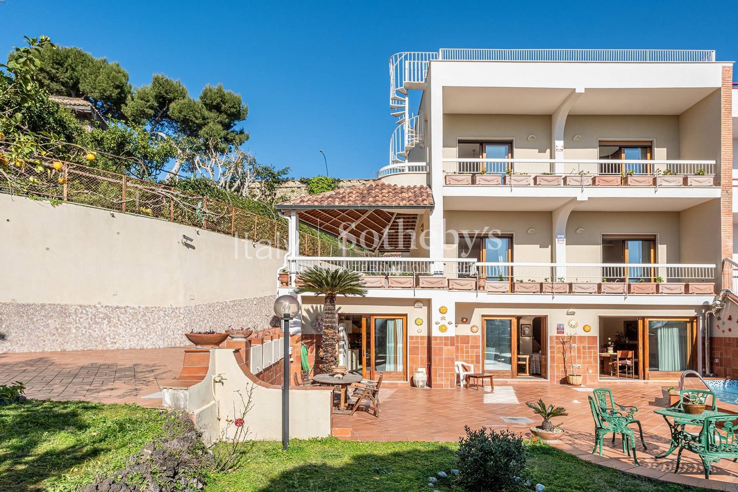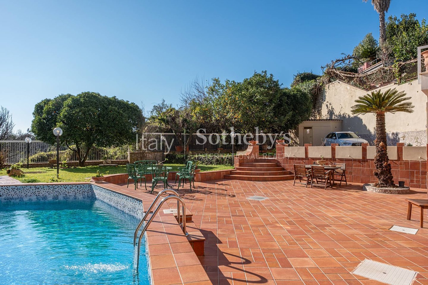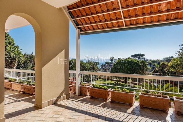 Von der großen Panoramaterrasse führt eine Treppe schließlich zur Solarium-Zone, von der aus man einen herrlichen Blick auf das Meer genießen kann. Die Innenräume sind lichtdurchflutet und großzügig gestaltet. Auch der Außenbereich der Villa ist äußerst einladend, mit einem gepflegten Garten und einem Pool, ideal für entspannte Momente und gesellige Mahlzeiten im Freien.