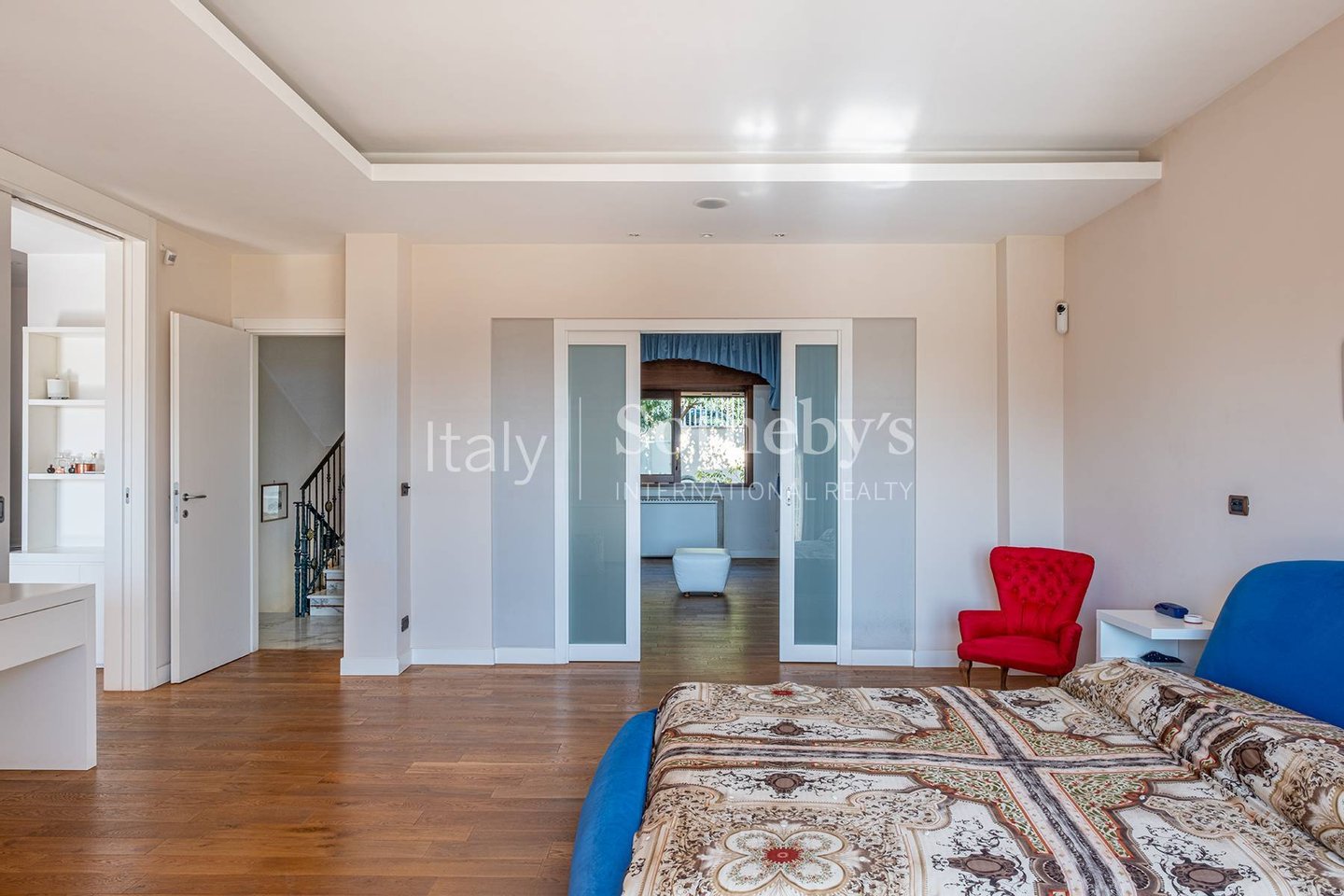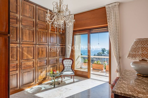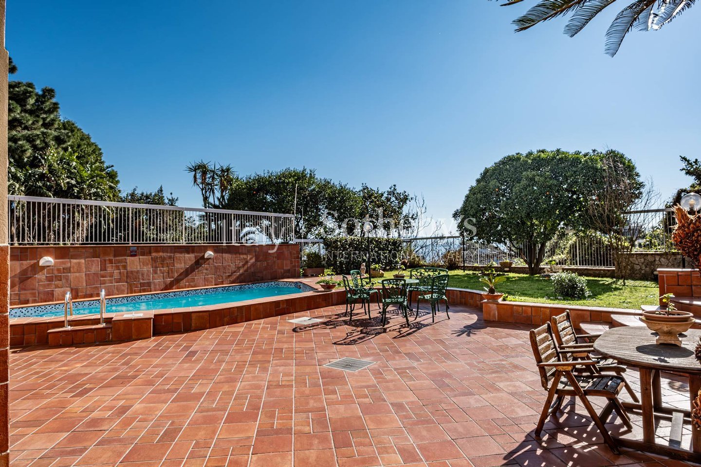 Von der großen Panoramaterrasse führt eine Treppe schließlich zur Solarium-Zone, von der aus man einen herrlichen Blick auf das Meer genießen kann. Die Innenräume sind lichtdurchflutet und großzügig gestaltet. Auch der Außenbereich der Villa ist äußerst einladend, mit einem gepflegten Garten und einem Pool, ideal für entspannte Momente und gesellige Mahlzeiten im Freien.