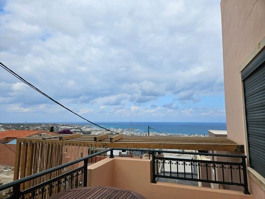 Die geräumige Dachterrasse bietet einen wunderschönen Panoramablick auf das Dorf Hersonissos und das Meer.