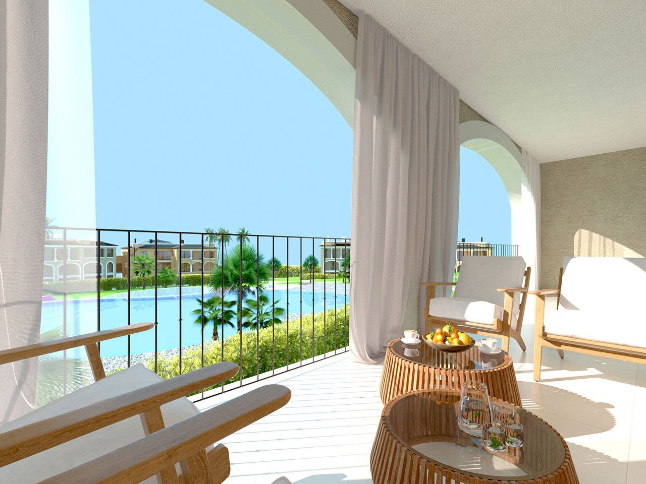 Die Anlage bildet einen komplett abgeschlossenen Komplex mit ausschließlichem Zugang für seine Anwohner und deren Besucher, entweder von der Straße oder direkt von der Tiefgarage aus. Im Zentrum der Gartenanlagen, die zum Teil auf typisch mallorquinischen Trockensteinmauern angelegt wurden, befindet sich die Sonnenterrasse an einem 700 Quadratmeter großen Gemeinschaftspool. Darüber hinaus gibt es ein Naturschwimmbad ohne Chlor.