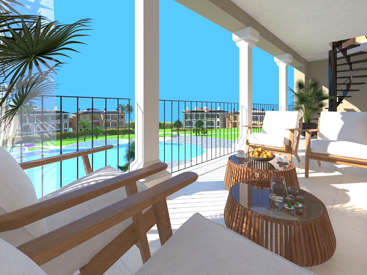 Die Anlage bildet einen komplett abgeschlossenen Komplex mit ausschließlichem Zugang für seine Anwohner und deren Besucher, entweder von der Straße oder direkt von der Tiefgarage aus. Im Zentrum der Gartenanlagen, die zum Teil auf typisch mallorquinischen Trockensteinmauern angelegt wurden, befindet sich die Sonnenterrasse an einem 700 Quadratmeter großen Gemeinschaftspool. Darüber hinaus gibt es ein Naturschwimmbad ohne Chlor.