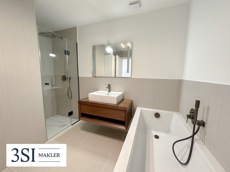 - Badezimmer mit Badewanne, Dusche und Waschmaschinenanschluss