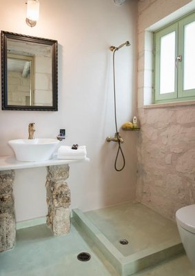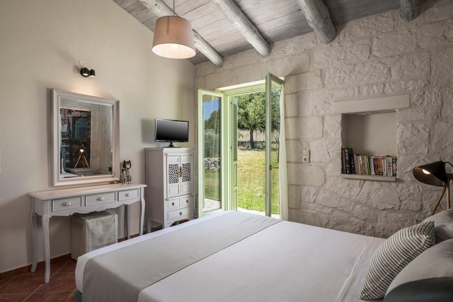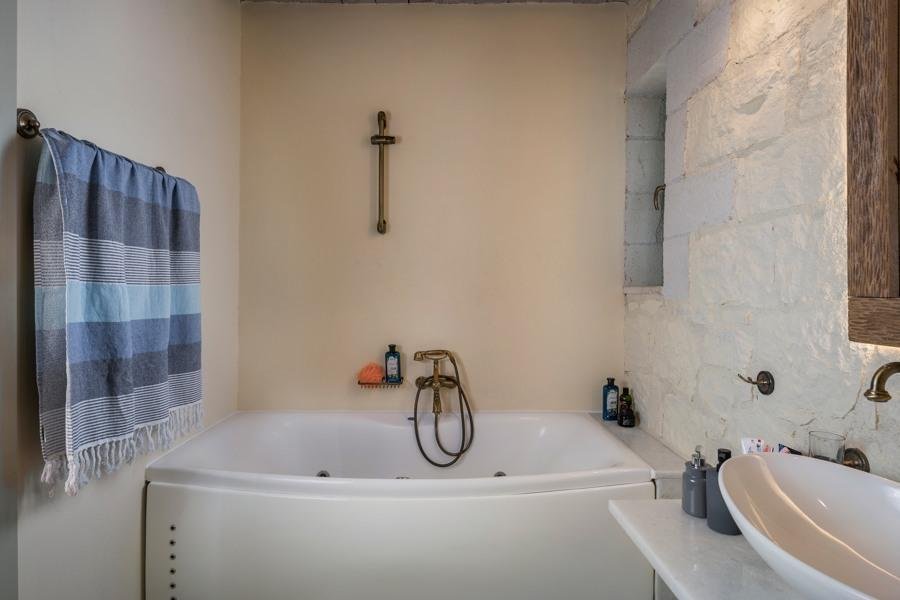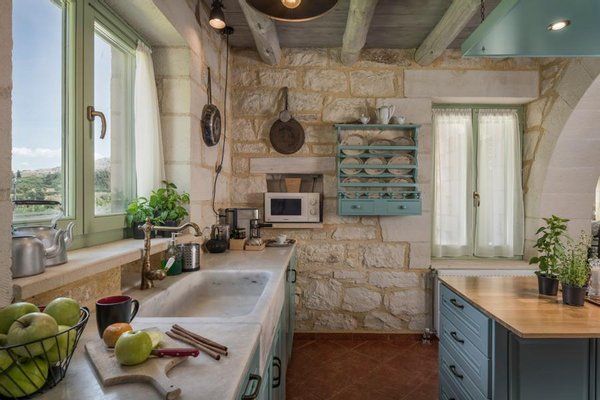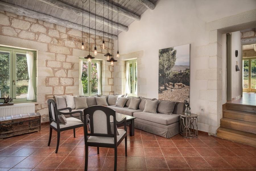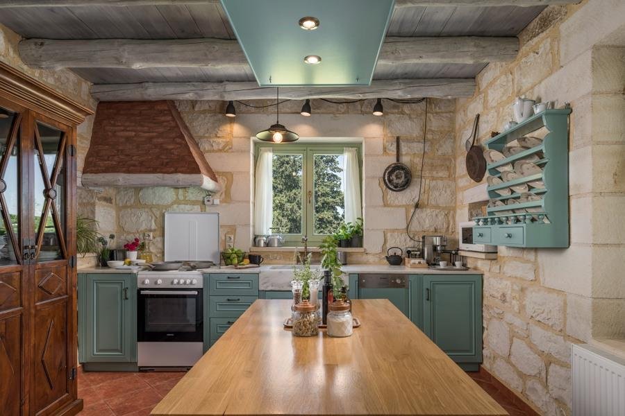 Durch den Haupteingang finden Sie sich als erstes in einem sehr schönen und gemütlichen Wohnzimmerbereich wieder. Der Loungebereich verfügt über eine große L-förmige Couch, die dem Kamin zugewandt ist, was energieeffizient ist. Es hat eine minimale, aber geschmackvolle Dekoration mit dezenter Beleuchtung und ist außerdem luftig und hell. Durch die Stein- und Holzdetails an den Wänden werden Sie sich sofort wie zu Hause fühlen, wobei das Haus auch durch die hohen Decken seinen Charakter behält. Der Küchenbereich ist offen zum Wohnzimmer, während ein separater Essbereich ebenfalls vorhanden ist. Die farbliche Abstimmung der Ausstattung und der Möbel ist sehr entspannend für das Auge. Dort werden Sie feststellen, dass alle notwendigen Geräte wie Kühlschrank, Geschirrspüler, Backofen und Mikrowelle vorhanden sind. Es gibt viele Schränke, in denen Sie Ihr Kochmaterial und Ihre Lebensmittel aufbewahren können.