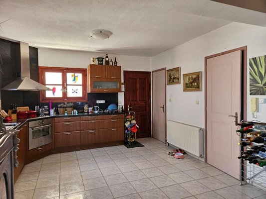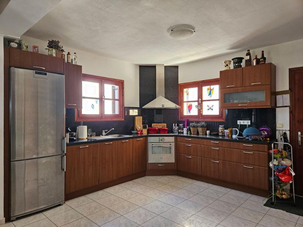Die Küche verfügt über große moderne Schränke, einen Elektroherd mit Backofen, einen großen Kühl-/Gefrierschrank und einen Geschirrspüler. Es gibt auch einen Abstellraum.
