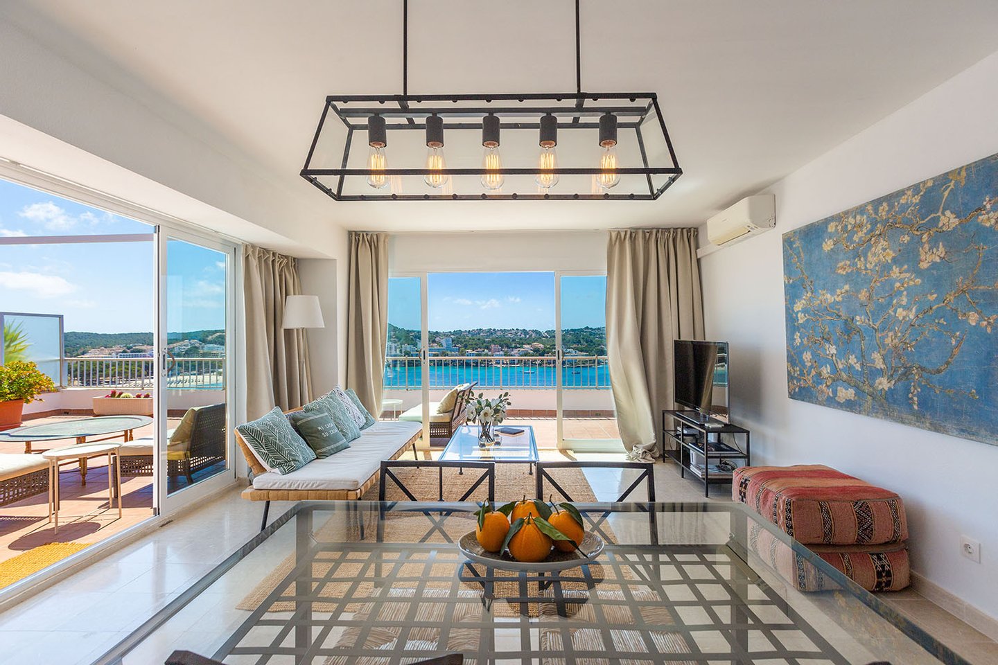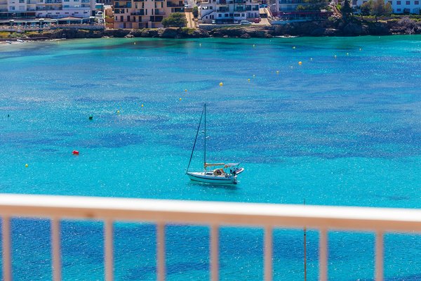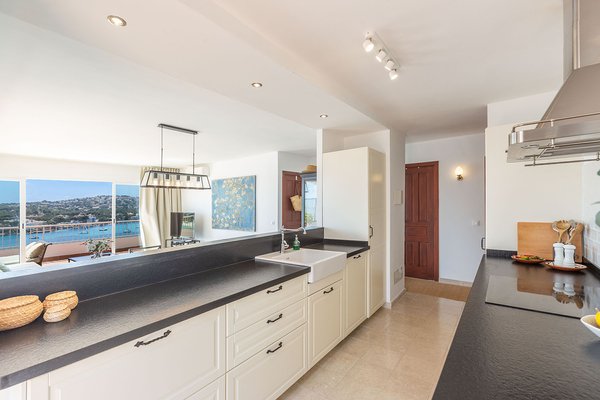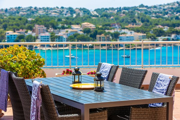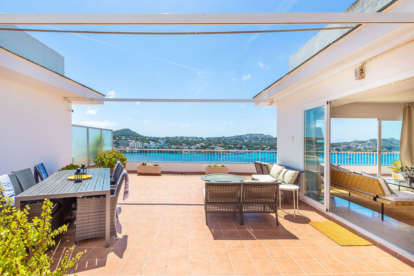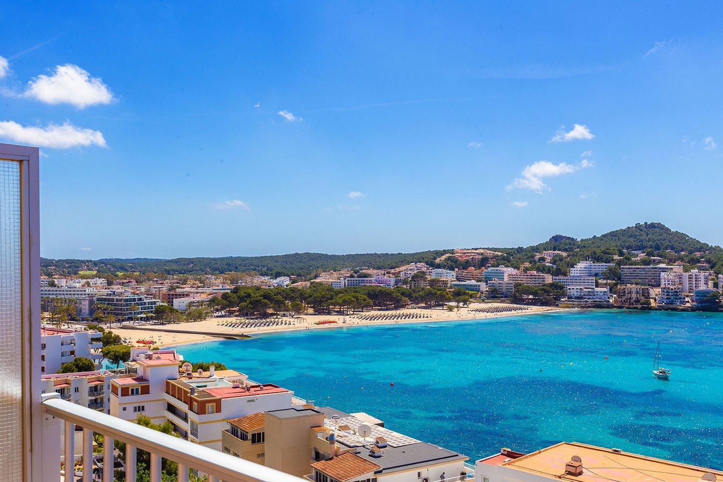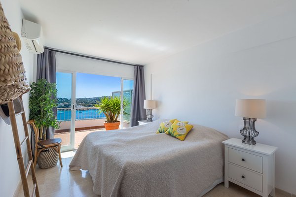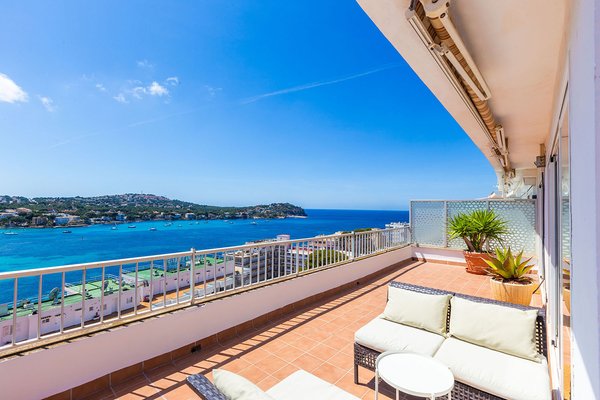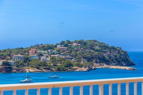 Dieses südorientierte Apartment mit wunderbarem Blick über die Bucht von Santa Ponsa befindet sich in der 7. Etage eines gepflegten Apartmentgebäudes in 2. Meereslinie, nur ein paar Schritte vom Meer entfernt. Das Ortszentrum mit einem umfangreichen Angebot an Restaurants, Bars und Einkaufsmöglichkeiten sowie Ärztezentren und Banken liegt praktisch vor der Haustüre. Zahlreiche Sport- und Freizeiteinrichtungen sowie schöne Badebuchten und mehrere Yachthäfen sind in wenigen Autominuten zu erreichen. Die Wohnfläche der renovierten und modern ausgestatteten Wohnung teilt sich auf in einen Wohn-/ Essbereich mit offener Küche und Zugang zur 115 m² großen teil überdachten Terrasse mit spektakulärer Aussicht, zwei Schlafzimmer, beide mit Terrassenzugang, und zwei Bäder (eines davon en suite). Hinzu kommt ein geräumiger Abstellraum, der auch als kleines Schlafzimmer oder Büro genutzt werden kann. Den Bewohnern der Anlage stehen nicht zugewiesene Parkplätze zur Verfügung.