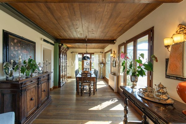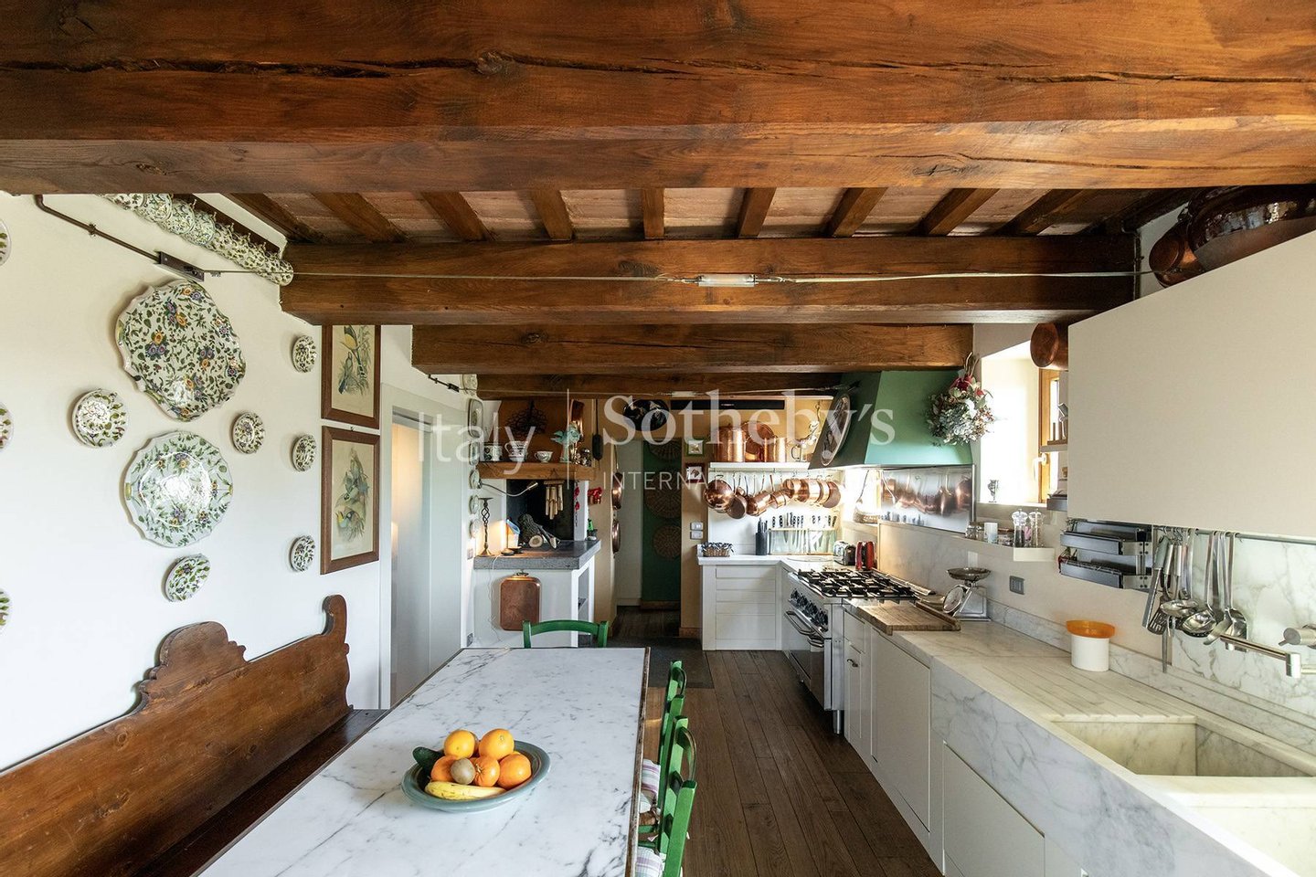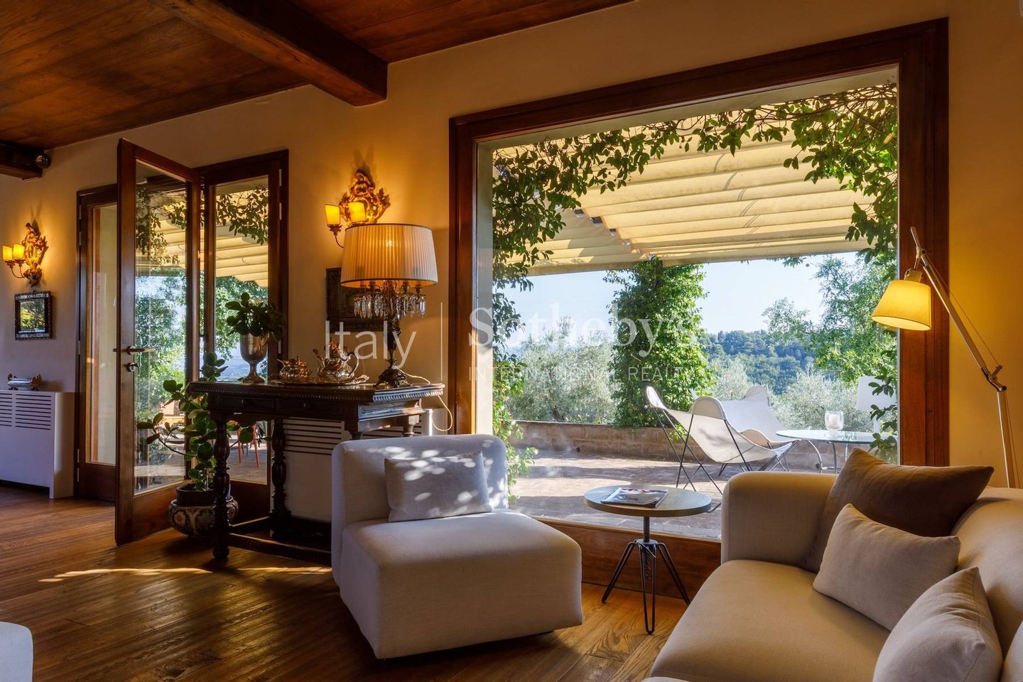 Die im Jahr 2005 renovierte Villa besticht durch hochwertige Ausstattungen und eine durchdachte Raumaufteilung. Sie umfasst einen Eingangsbereich, ein Gäste-WC, ein großzügiges Wohnzimmer, eine TV-Ecke mit Kamin, eine voll ausgestattete Küche, ein Esszimmer sowie eine Veranda mit Blick auf den Garten. Eine Cottotreppe führt hinunter zu einem charmanten kleinen Weinkeller. Im Obergeschoss befinden sich zwei Doppelzimmer sowie die Hauptsuite mit begehbarem Kleiderschrank - jedes Schlafzimmer verfügt über ein eigenes Bad. Ein offenes Zwischengeschoss dient als Arbeitsbereich, während die Terrasse einen herrlichen Panoramablick auf den Garten und die umliegende Landschaft bietet.