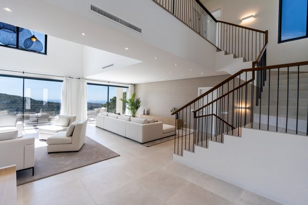 Der offene Grundriss des Wohnbereichs umfasst eine doppelte Deckenhöhe, zwei Sitzbereiche, einen Essbereich, eine moderne und effiziente italienische Küche, die vollständig mit deutschen Geräten ausgestattet ist, einen Bürobereich und ein sehr elegantes Treppenhaus. Der Wohn- und Essbereich hat große Schiebefenster, die Zugang zu den großen, teilweise überdachten Terrassen bieten, von denen man einen fantastischen Blick auf die Berge und das Meer hat.