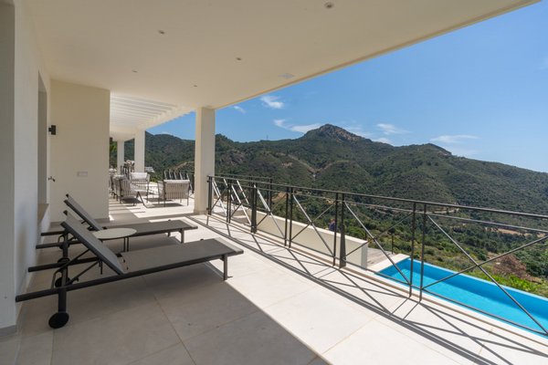 Im Obergeschoss befinden sich 3 Gästeschlafzimmer, die alle über ein voll ausgestattetes Bad en-suite verfügen. Zwei Schlafzimmer haben separate große Terrassen, die sich perfekt zum Sonnenbaden eignen. Von den Terrassen auf der Hauptebene führen 2 Treppen hinunter zur Poolebene und zum Garten mit unschlagbarem Panoramablick.