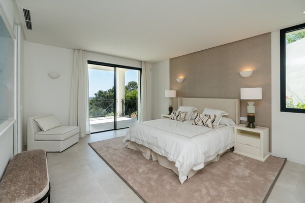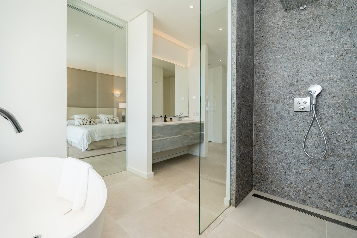 Das Hauptschlafzimmer ist komplett privat und verfügt über große Einbauschränke, ein eigenes Badezimmer, eine begehbare Dusche, eine freistehende Badewanne, zwei Waschbecken und eine separate Toilette. Große Fenster ermöglichen den Zugang zu einer überdachten Terrasse, von der aus man den Panoramablick genießen kann.