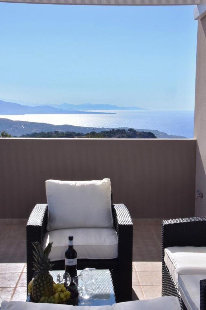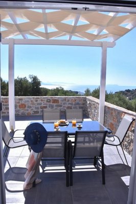 Im ersten Stock befindet sich ein Hauptschlafzimmer mit Bad und Zugang zu einer geräumigen Veranda / einem Balkon mit Pergola und ausgezeichnetem Meer- und Bergblick.