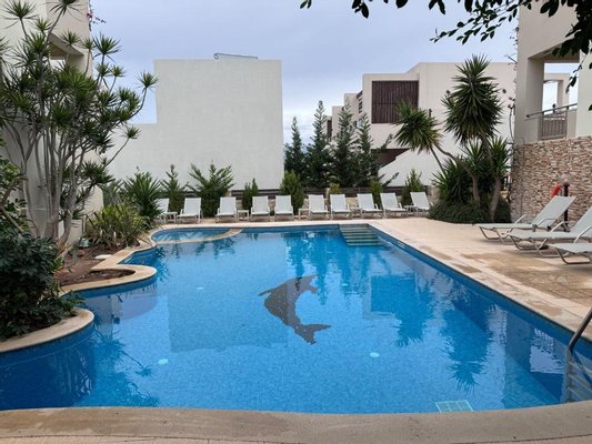 Im Erdgeschoss befindet sich ein großzügiger Wohnbereich mit Küche, Esszimmer, Wohnzimmer mit Kamin und Gäste-WC. Im ersten Obergeschoss befinden sich über eine Innentreppe zwei Schlafzimmer und ein Badezimmer. Die Schlafzimmer verfügen jeweils über einen Balkon mit Blick auf die Berge und die Umgebung. Die Maisonette-Wohnungen bieten außerdem ein großes Untergeschoss mit privatem Fitnessraum und Sauna. Zur Anlage gehören ein Gemeinschaftspool und ein wunderschön angelegter Gemeinschaftsgarten. Die Immobilie wird komplett ausgestattet und möbliert verkauft.