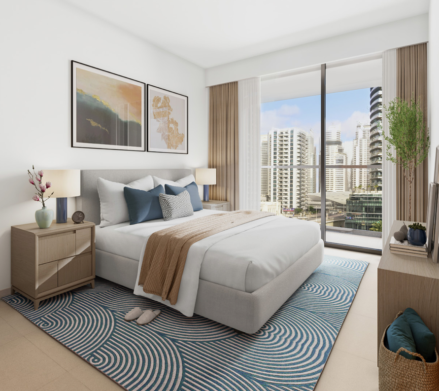 Die Wohnung liegt im begehrten Stadtteil Jumeirah Beach Residence in Dubai, nur wenige Schritte vom weißen Sandstrand und dem glitzernden türkisblauen Wasser des Persischen Golfs entfernt.