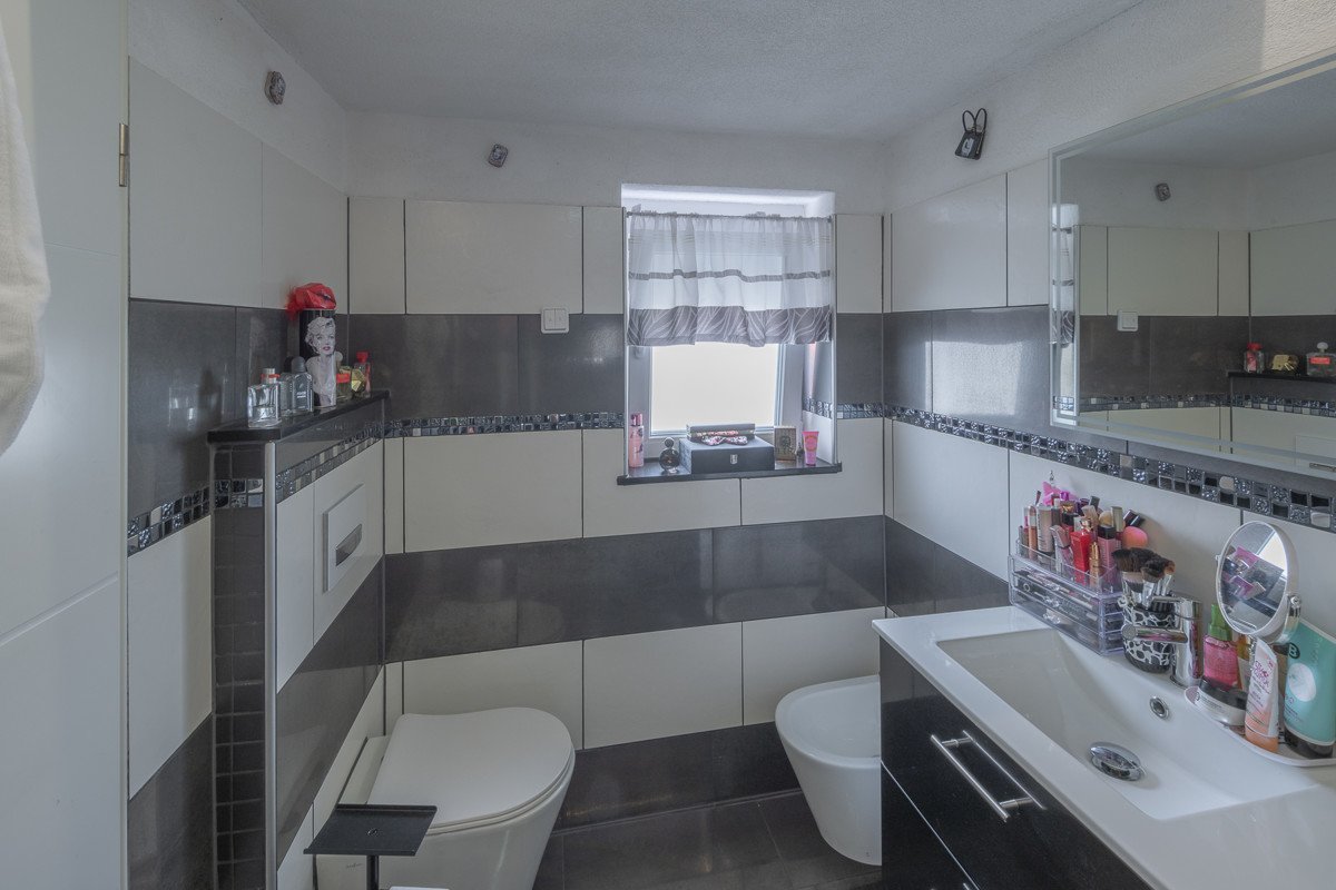 Die Obergeschosswohnung bietet ebenfalls 75 m² Wohnfläche mit einer großzügigen modernen Küche, einem Duschbad und einem weiteren Wannenbad im Dachgeschoss.